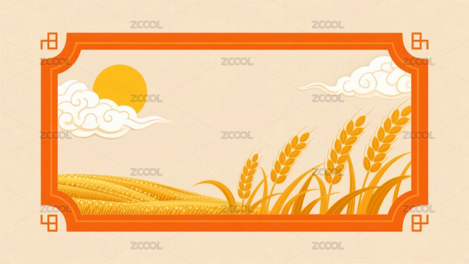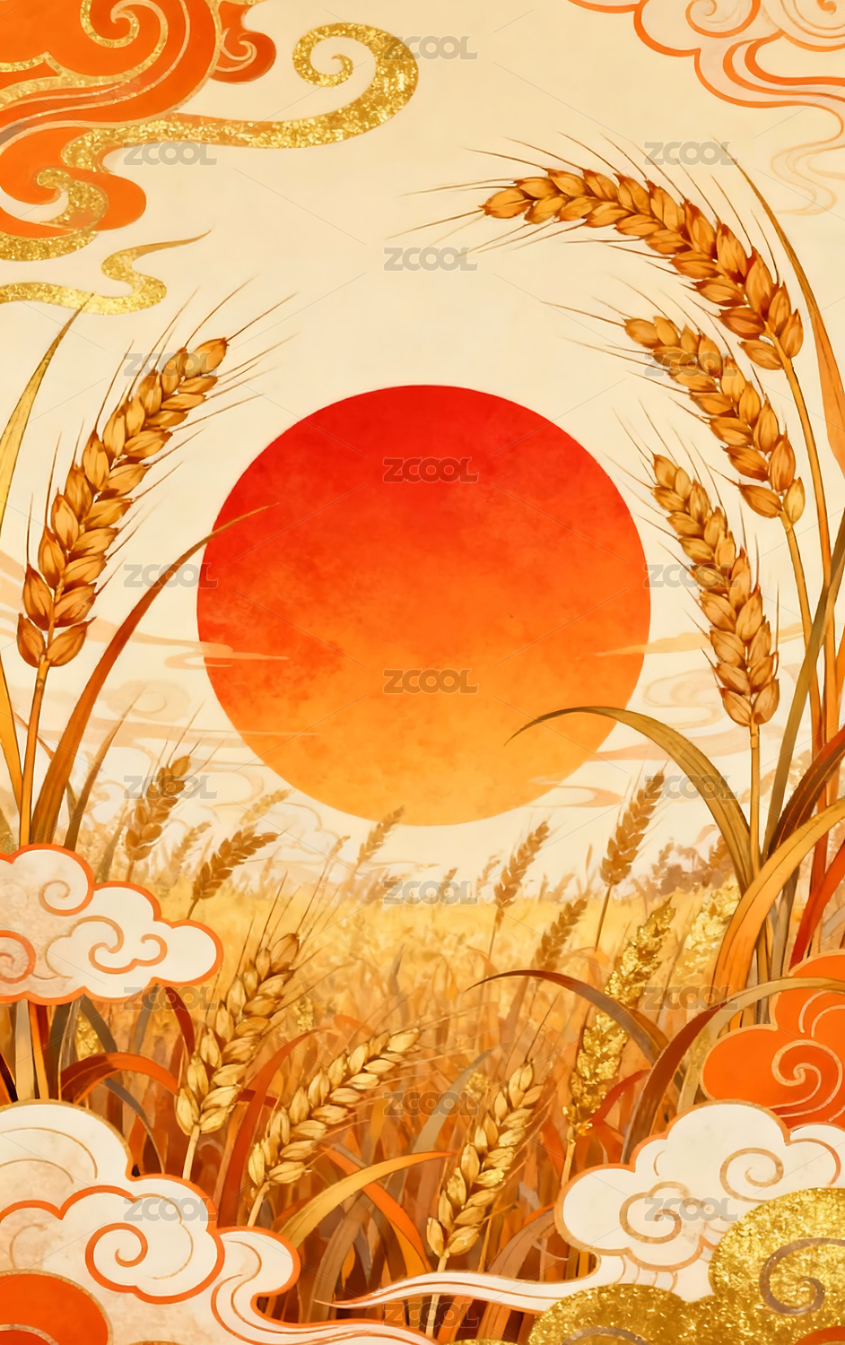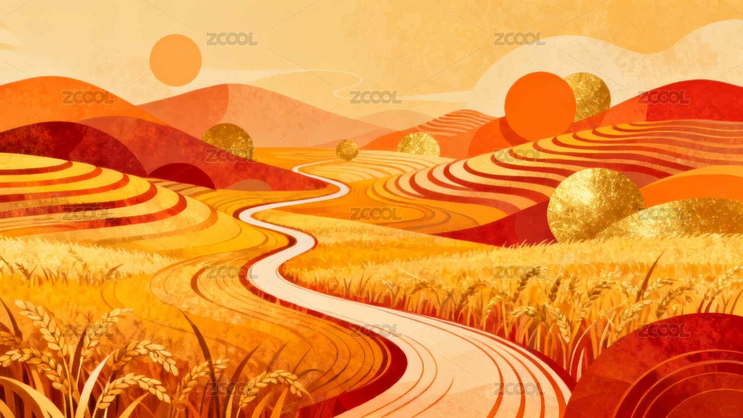 背景,秋天,秋季,插画,壁纸,祥云,夕阳,日落,丰收,麦田