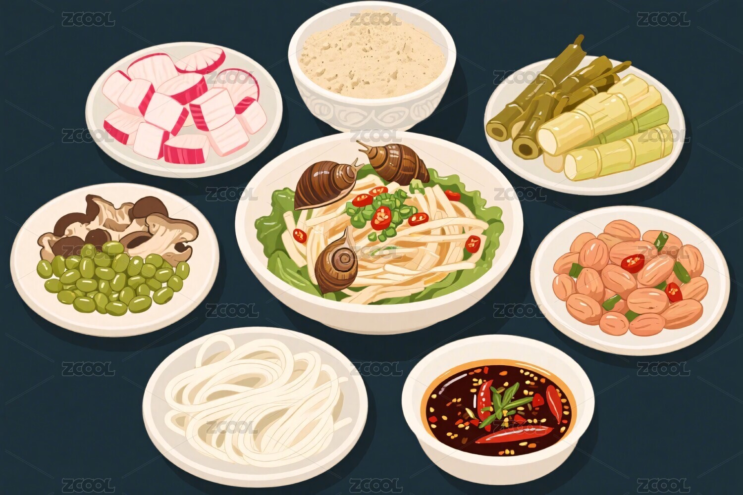 美食,插画,菜肴,摆盘,中式,蔬菜,坚果,丸子,粉条,炒菜
