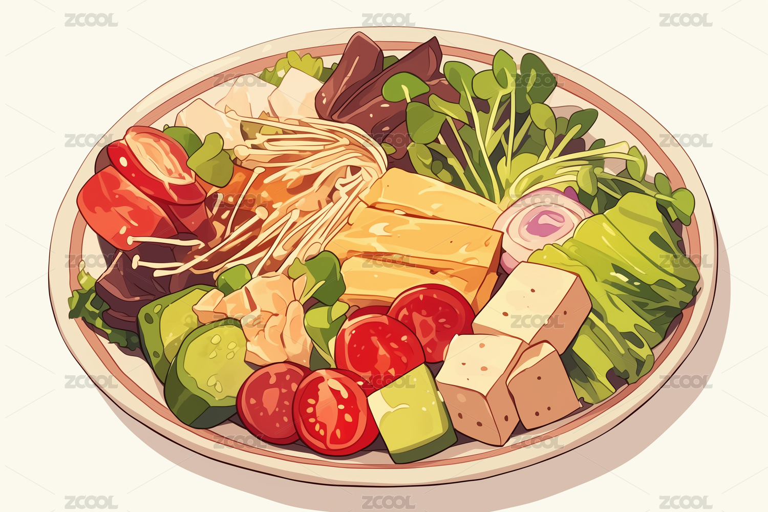 日漫风格 一盘蔬菜拼盘洋葱圣女果金针菇