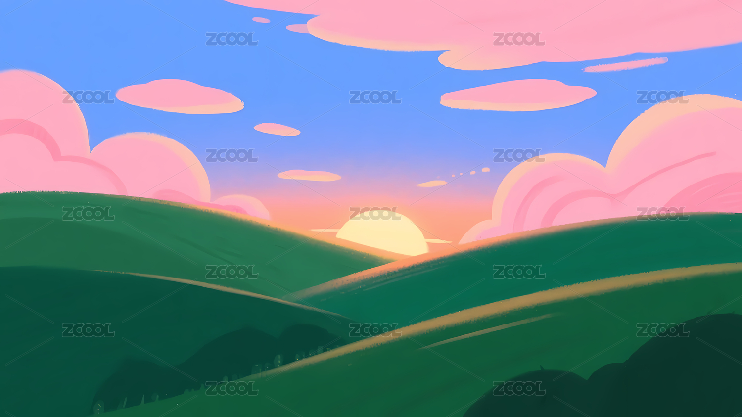 绿色山丘粉云黄太阳