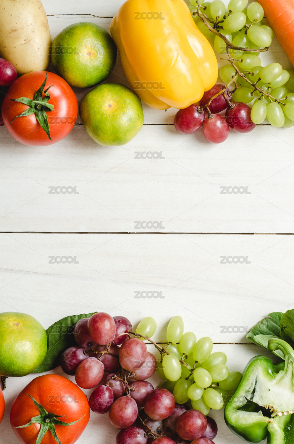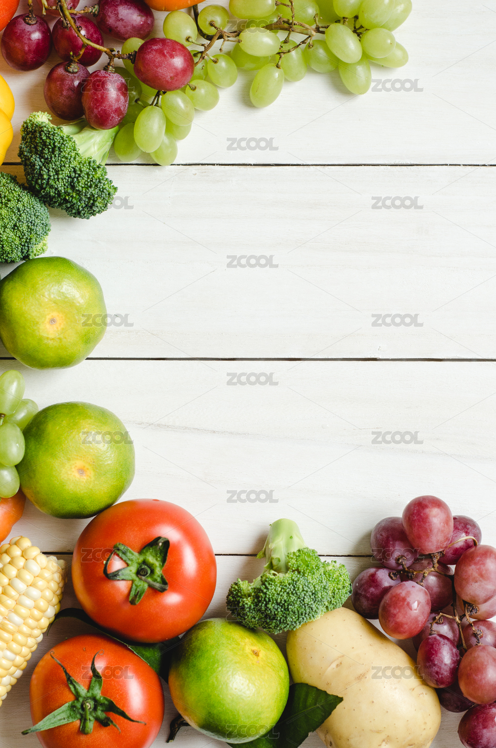 木纹背景上多种新鲜蔬菜水果俯拍留白
