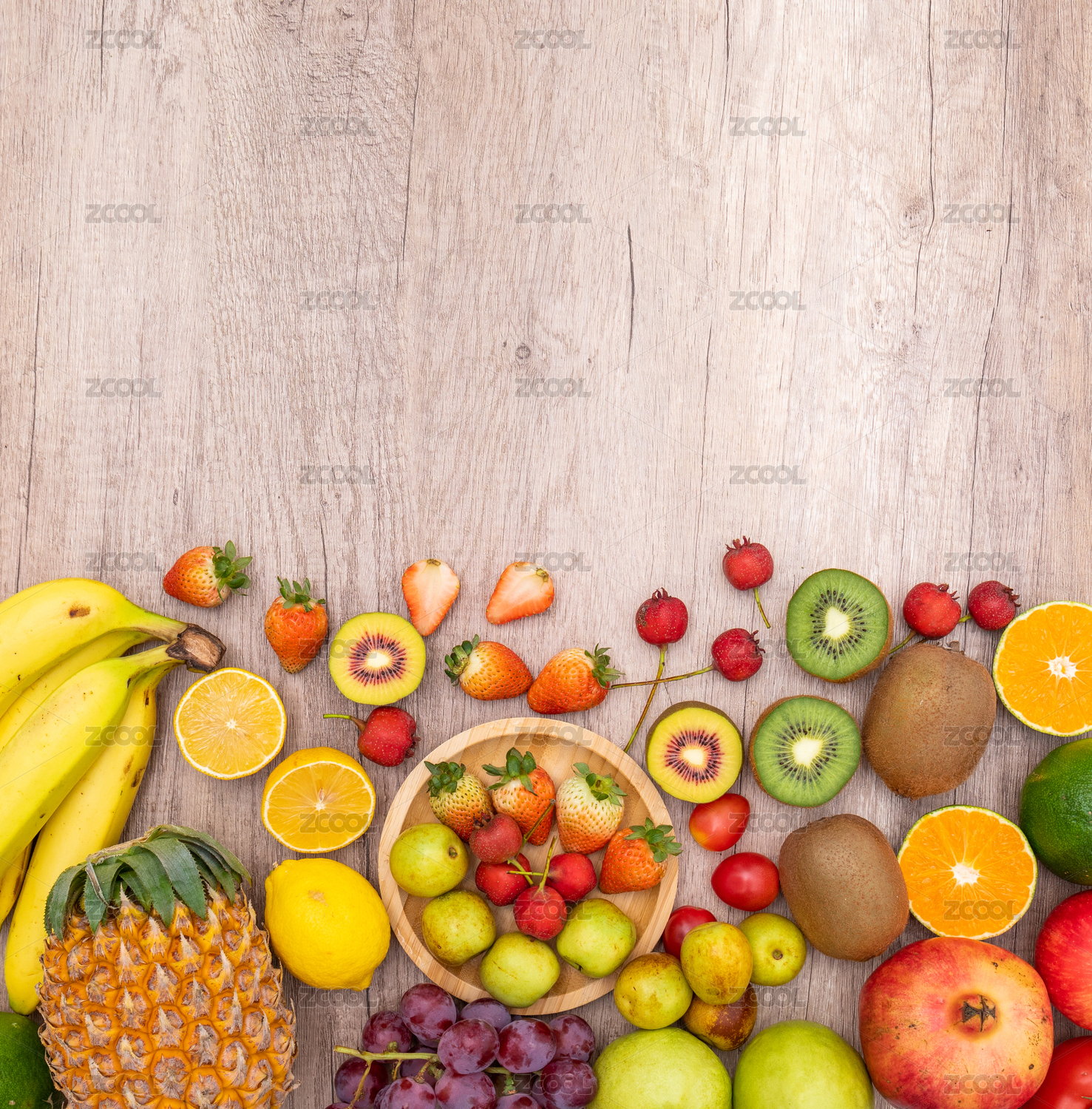 木纹背景上丰富多样的新鲜水果俯拍