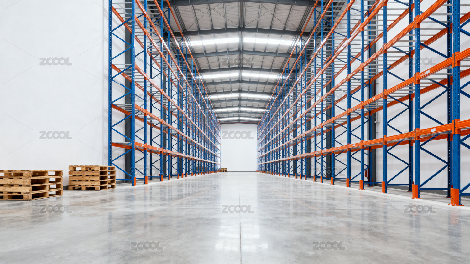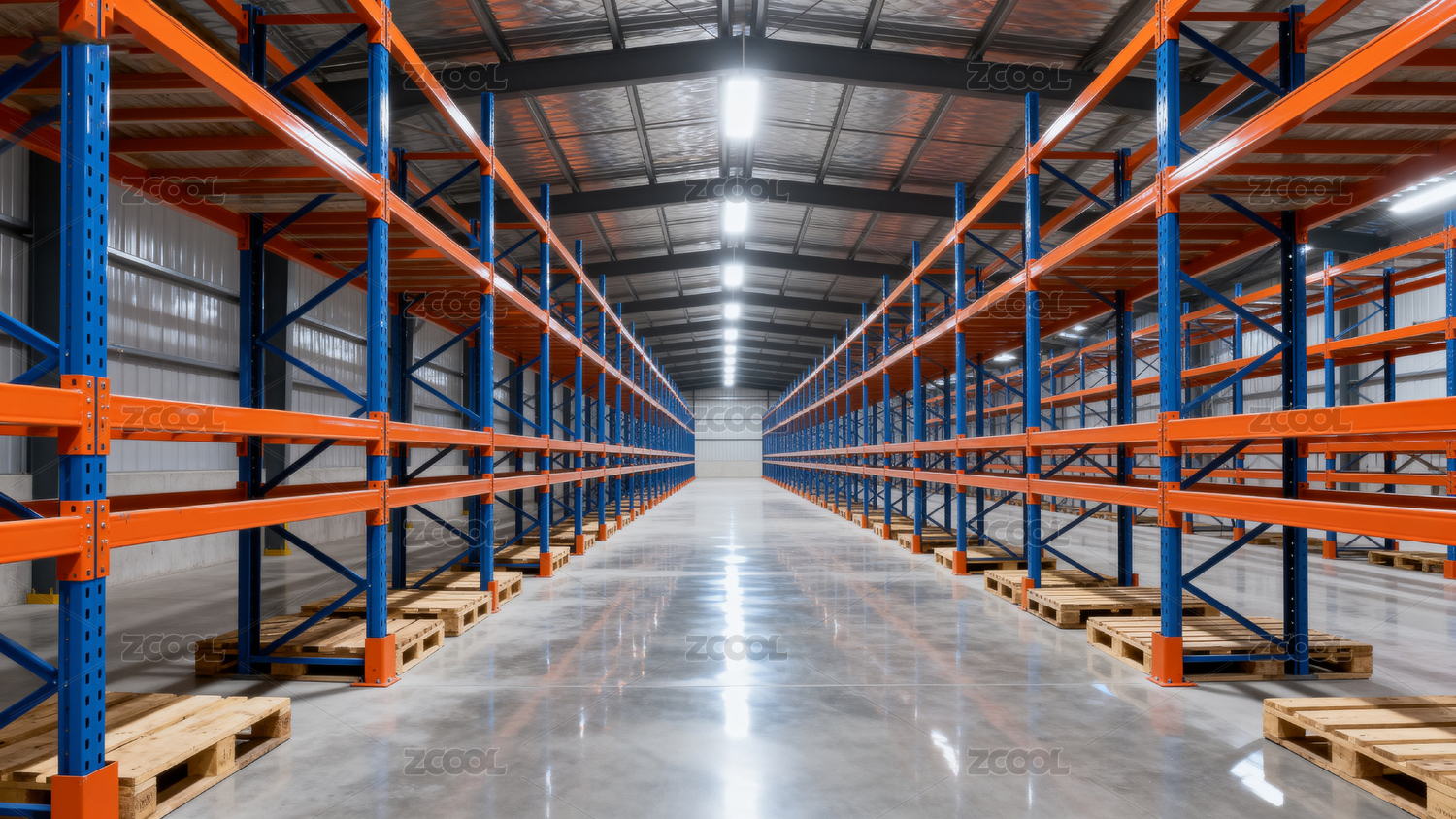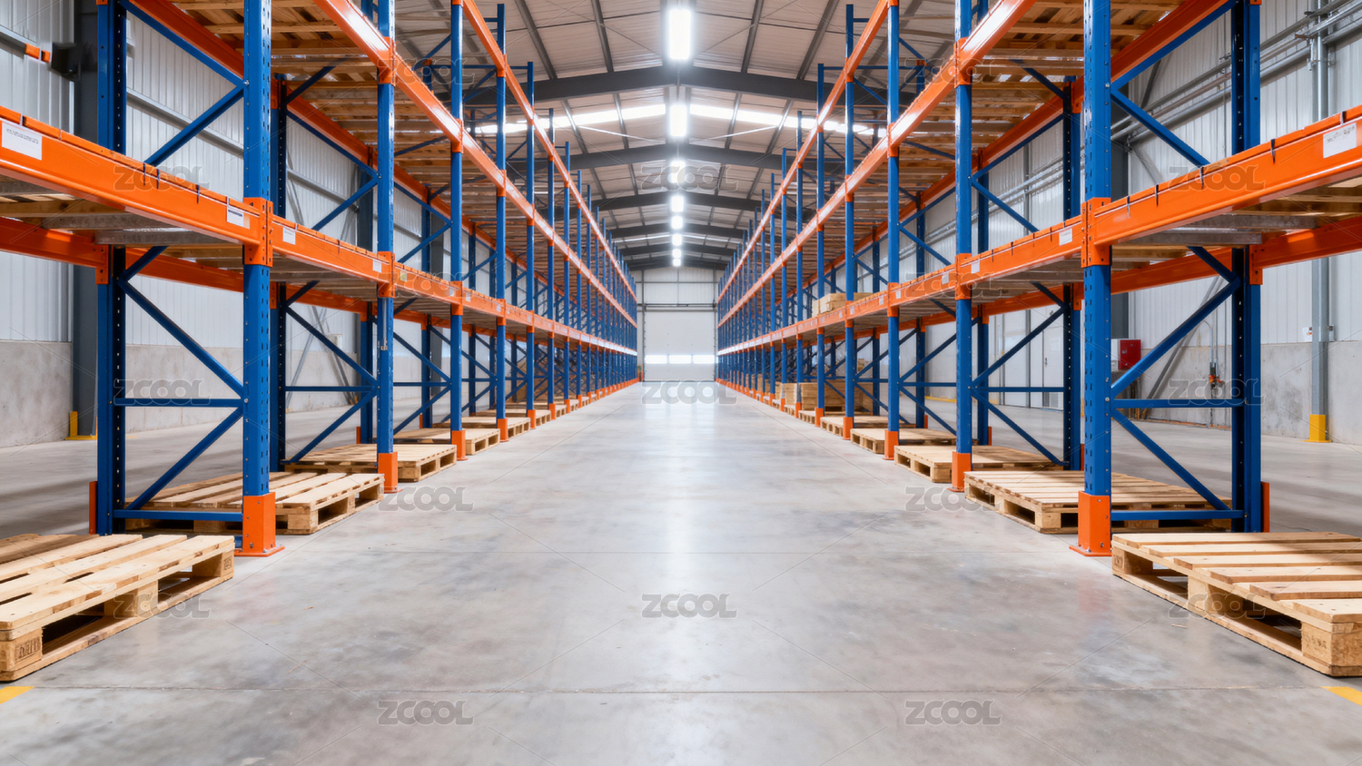 空旷仓库内橙蓝货架排列整齐