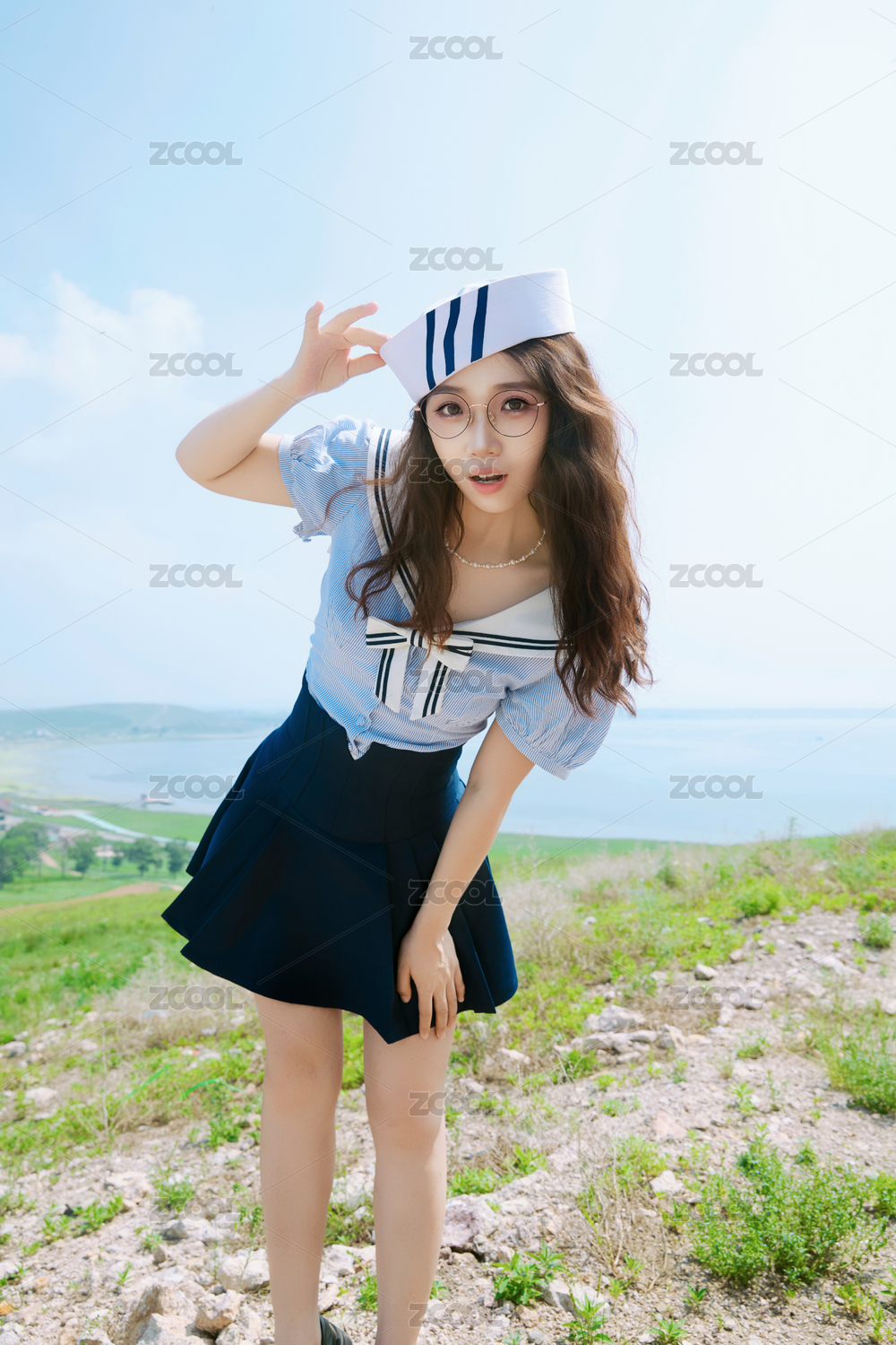 身穿水兵服在湖畔打卡拍照的亚洲美女