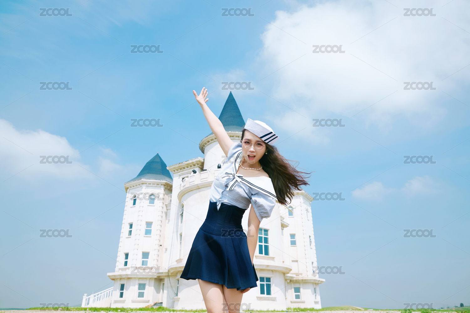 身穿水手服在城堡别墅前拍照打卡的亚洲美女