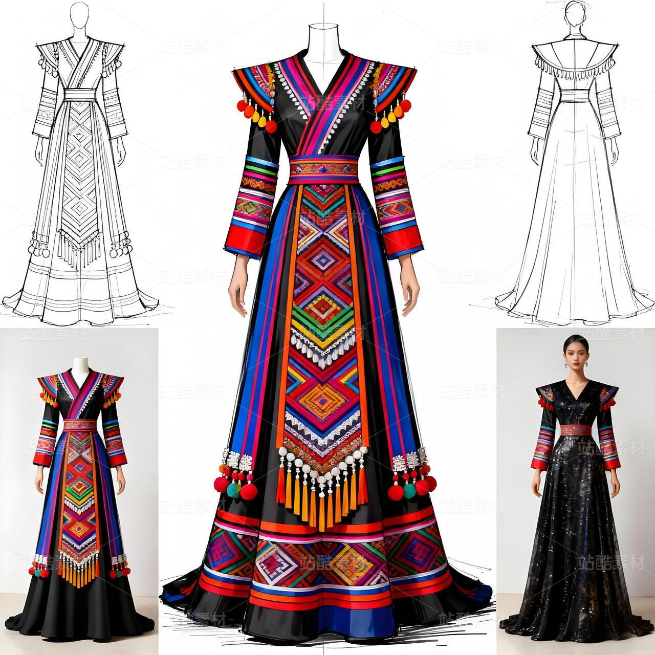 此系列壮族礼服设计巧妙实现了两大非遗文化的对话。设计师提取敦煌壁画中璎珞的飘逸线条与绚丽色彩,将其融入壮族传统服饰结构。上衣采用壮锦经典的菱形纹样,下摆则化用敦煌飞天流动的衣袂线条,在静态服装中营造动态美感。九宫格展示形式完整呈现了从正反面线稿到成品效果的设计全貌,腰间的银饰设计既保留了壮族传统银项圈的造型特征,又融入了敦煌璎珞的串珠元素。这种跨地域的文化融合,为民族服饰创新提供了全新视角,让千年文化在当代设计中焕发新生。