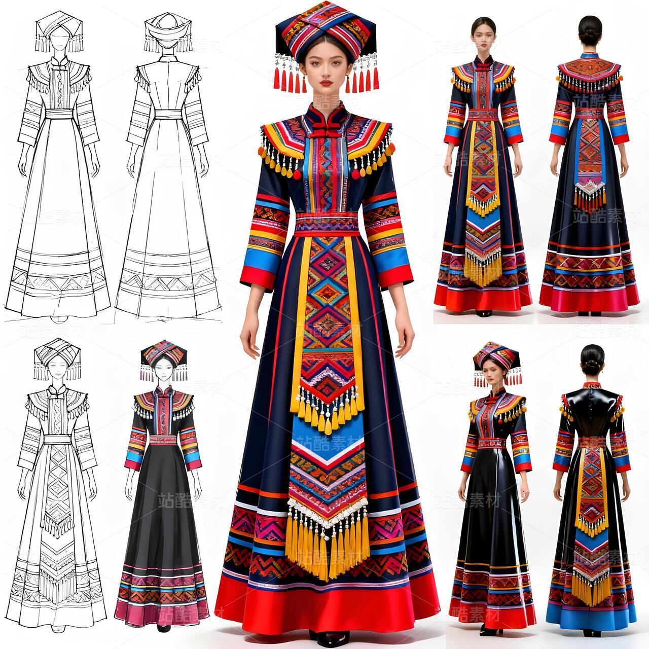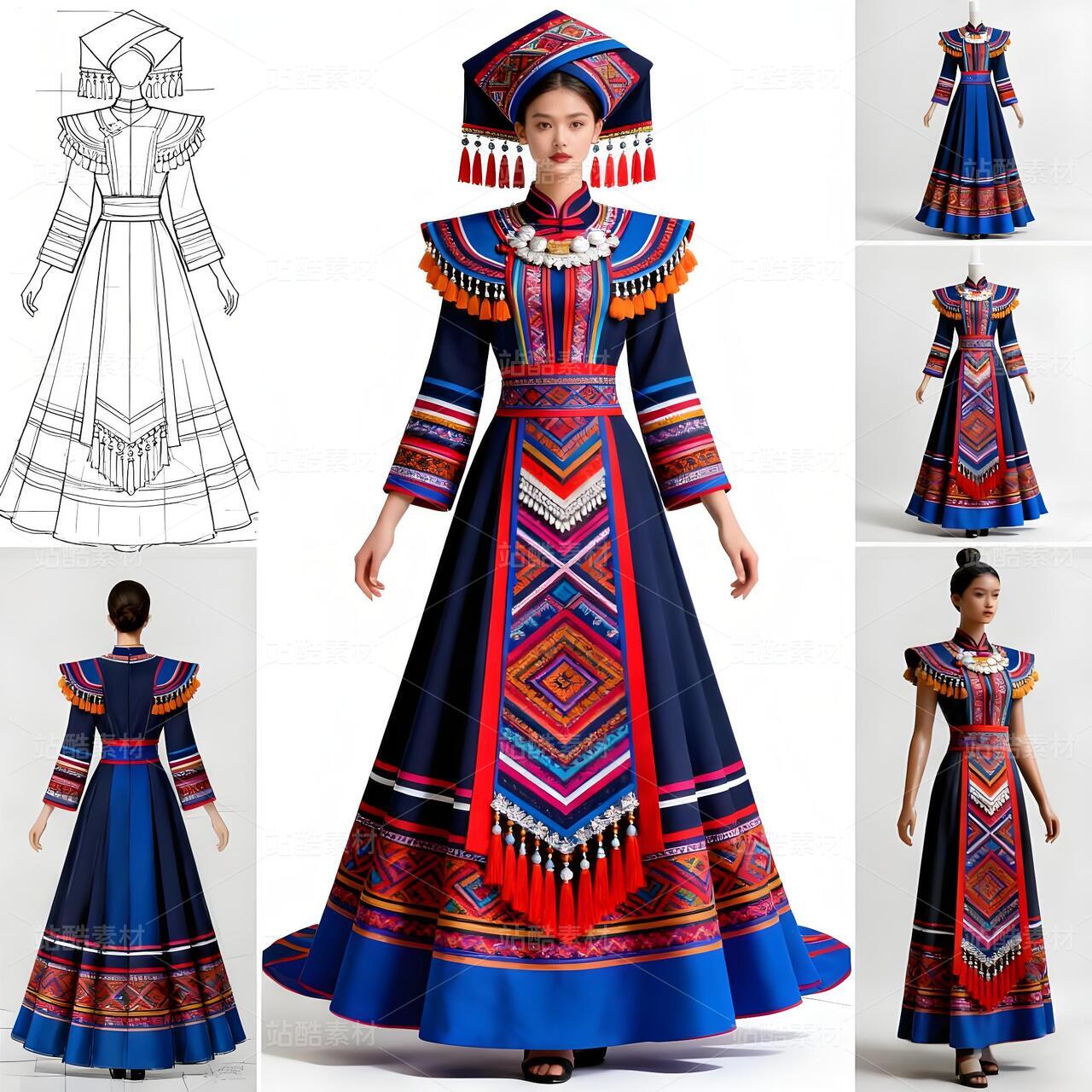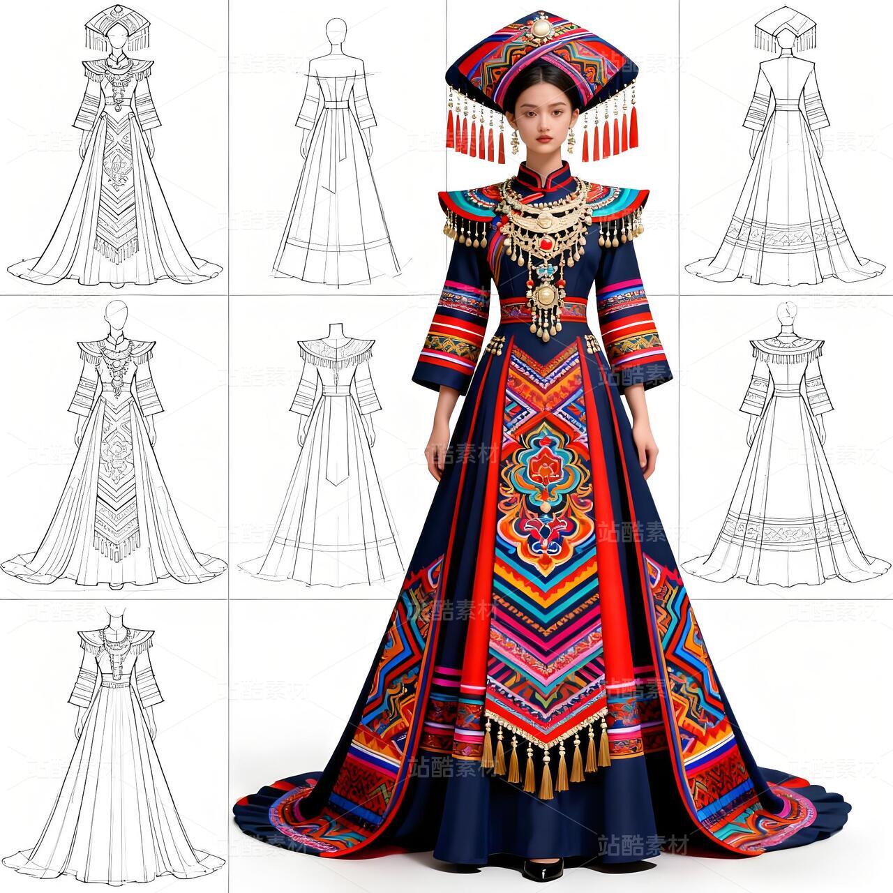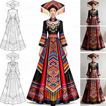 此系列壮族礼服设计巧妙实现了两大非遗文化的对话。设计师提取敦煌壁画中璎珞的飘逸线条与绚丽色彩,将其融入壮族传统服饰结构。上衣采用壮锦经典的菱形纹样,下摆则化用敦煌飞天流动的衣袂线条,在静态服装中营造动态美感。九宫格展示形式完整呈现了从正反面线稿到成品效果的设计全貌,腰间的银饰设计既保留了壮族传统银项圈的造型特征,又融入了敦煌璎珞的串珠元素。这种跨地域的文化融合,为民族服饰创新提供了全新视角,让千年文化在当代设计中焕发新生。