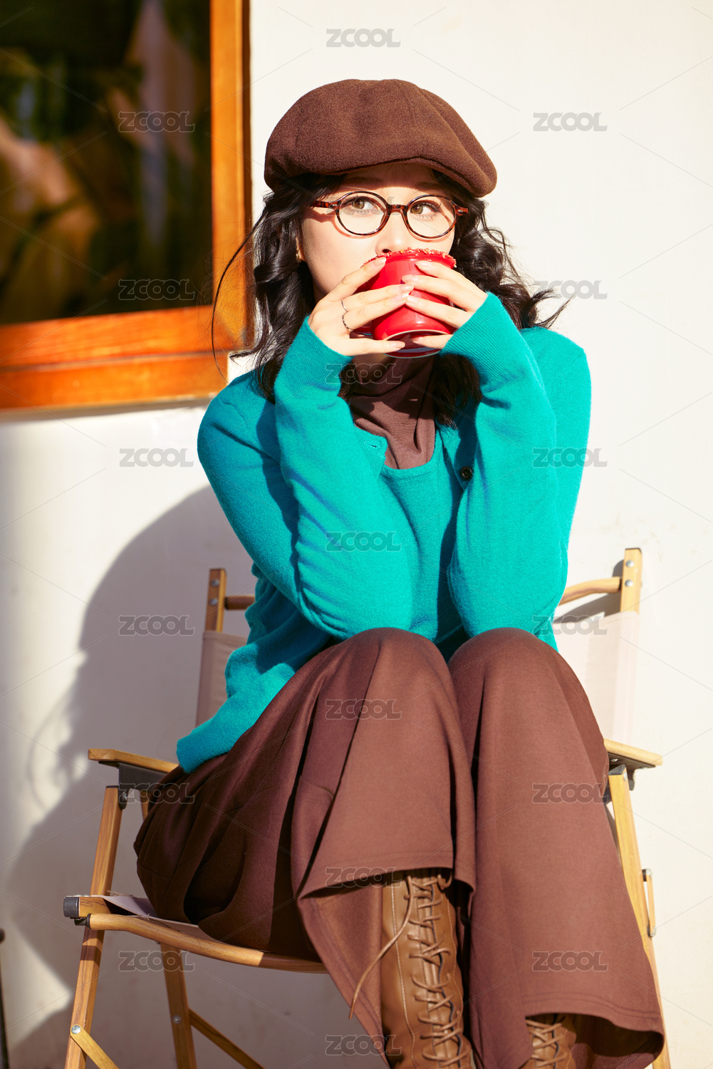 冬日午后在城市户外享受阳光的亚洲美女