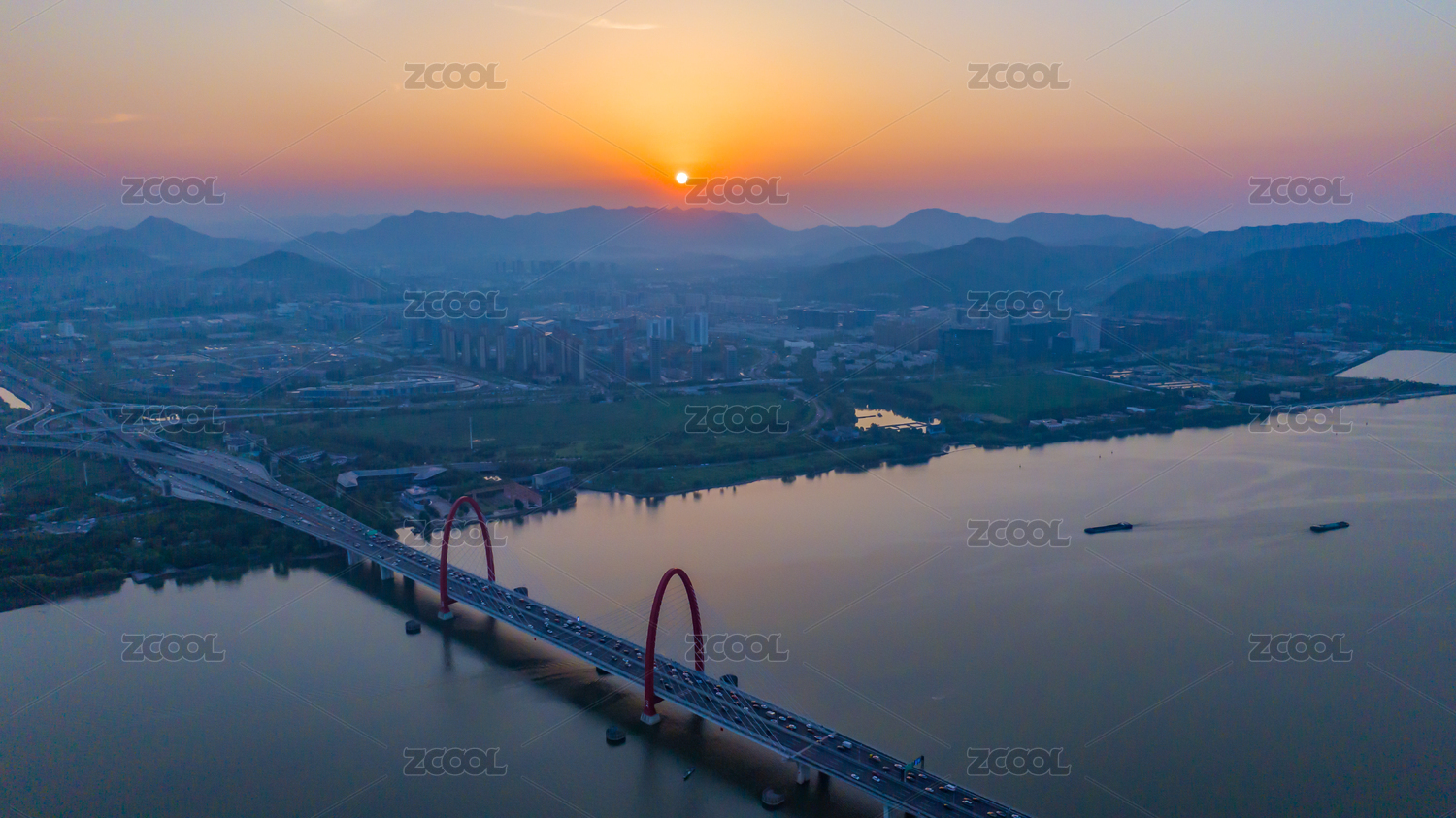 航拍杭州之江大桥日落美景
