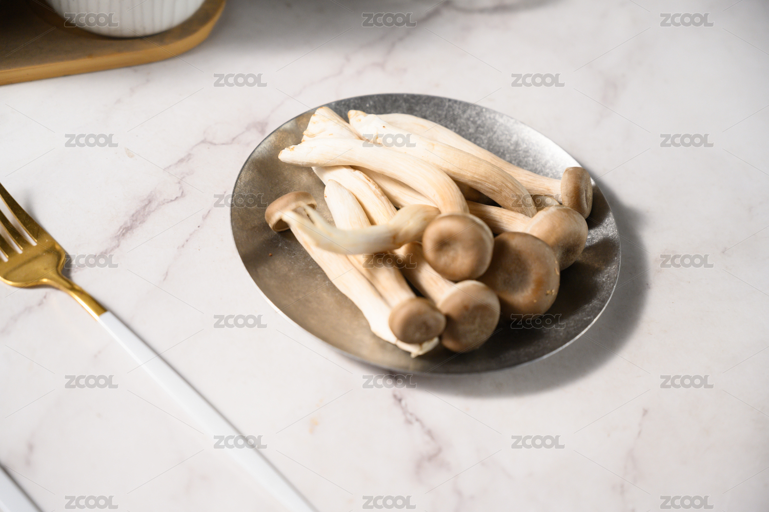 桌面上的盘子里的美味可口的新鲜鹿茸菇