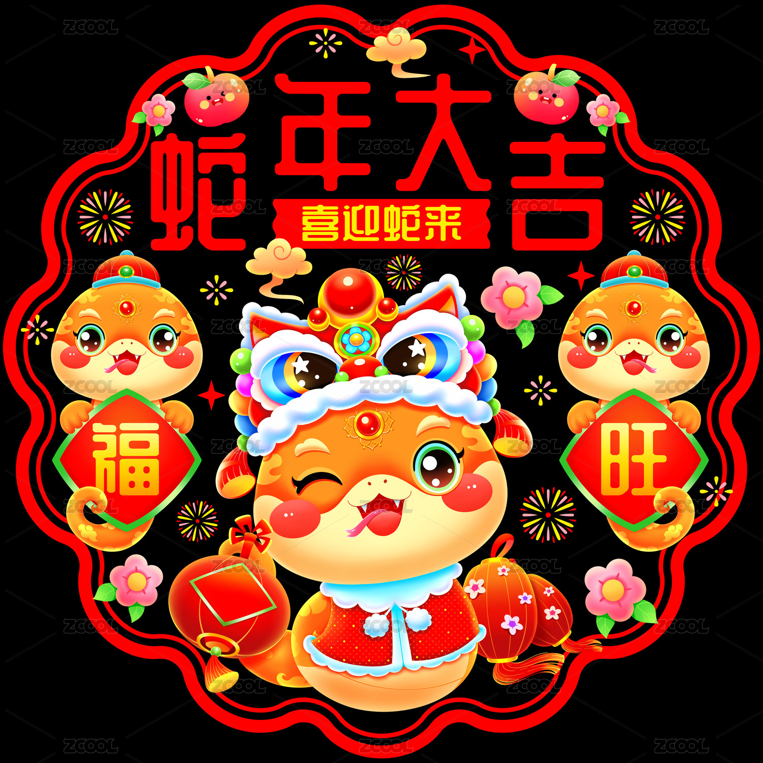 国潮春节新年蛇年生肖斗方蛇拜年窗花