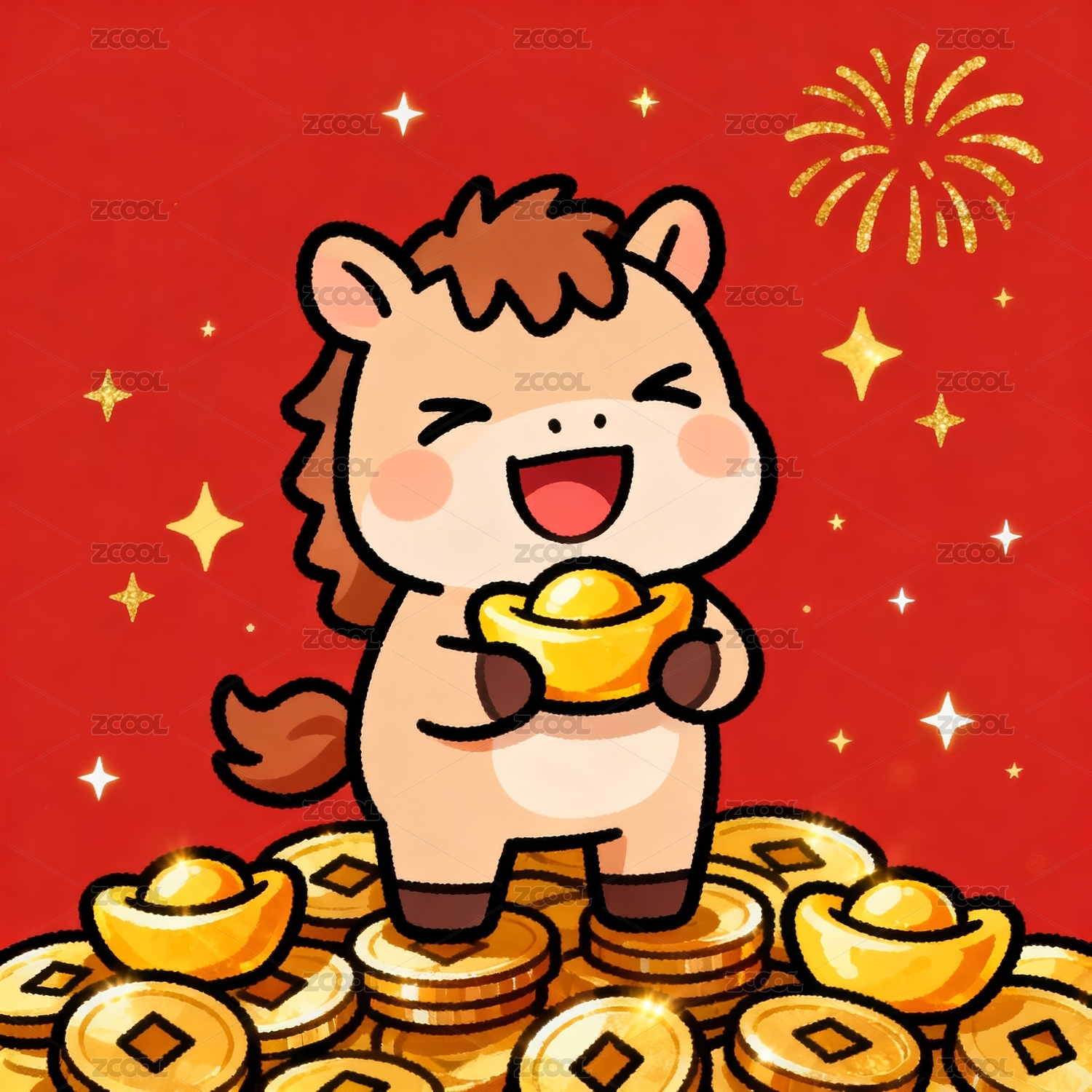 卡通小马喜庆招财场景