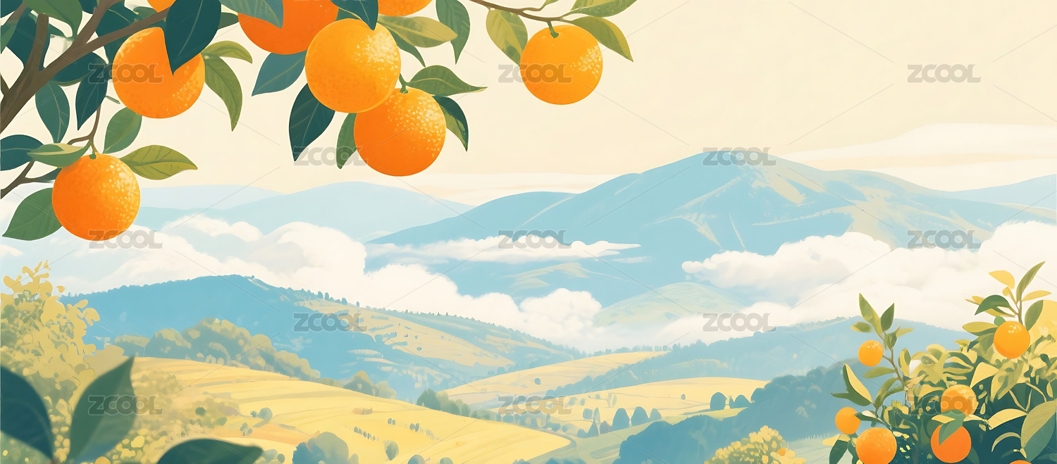 背景,秋天,秋季,插画,壁纸,橙子树,夕阳,落日,户外,黄昏