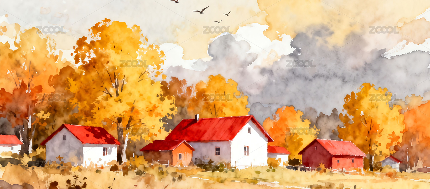背景,秋天,秋季,插画,壁纸,水彩,乡村,农村,房屋,树