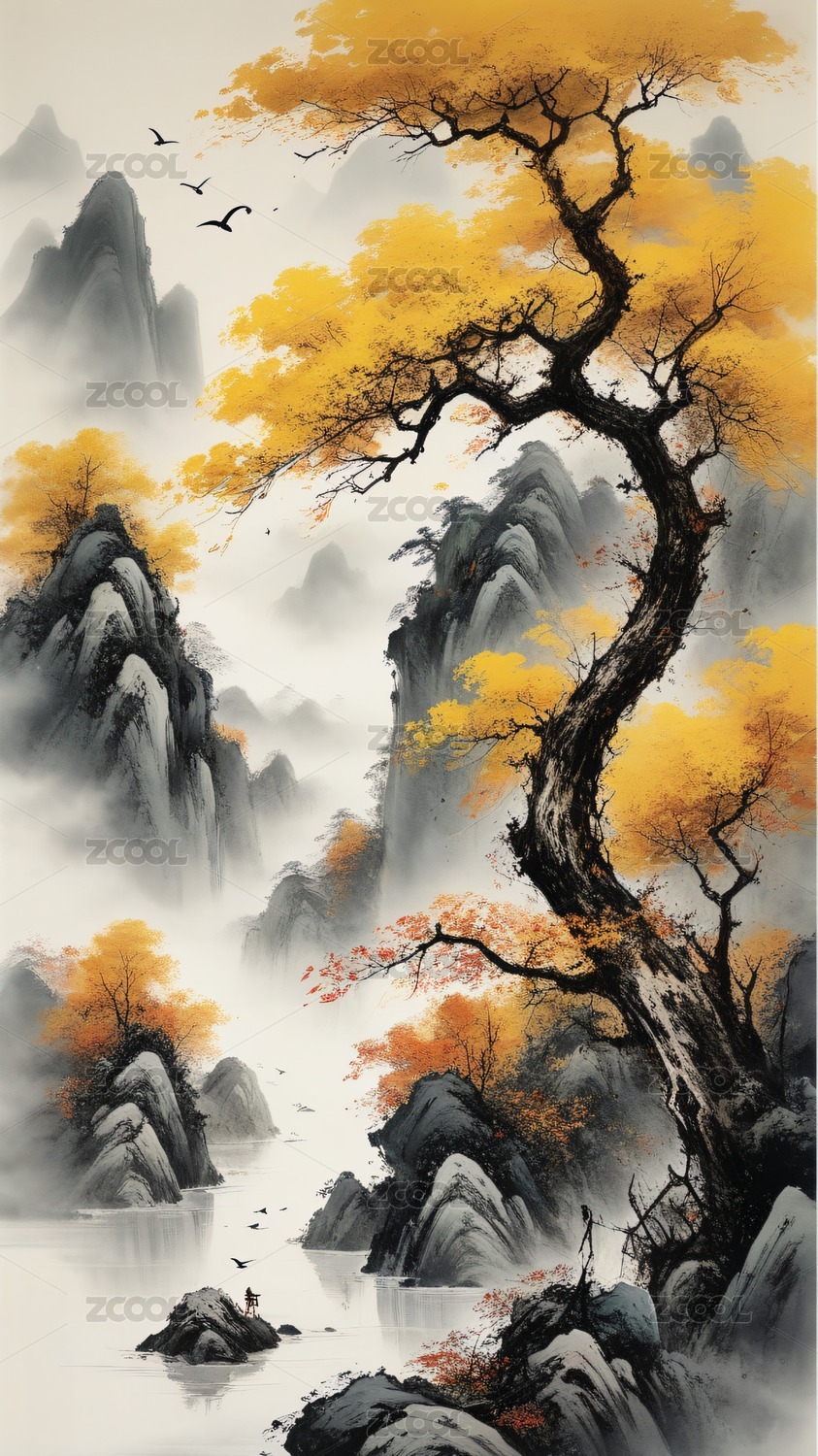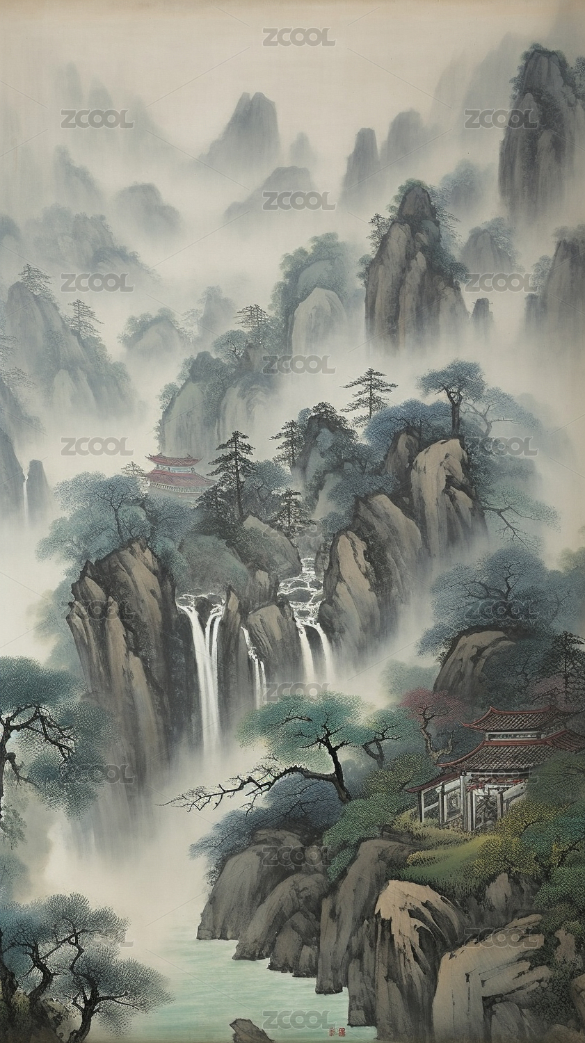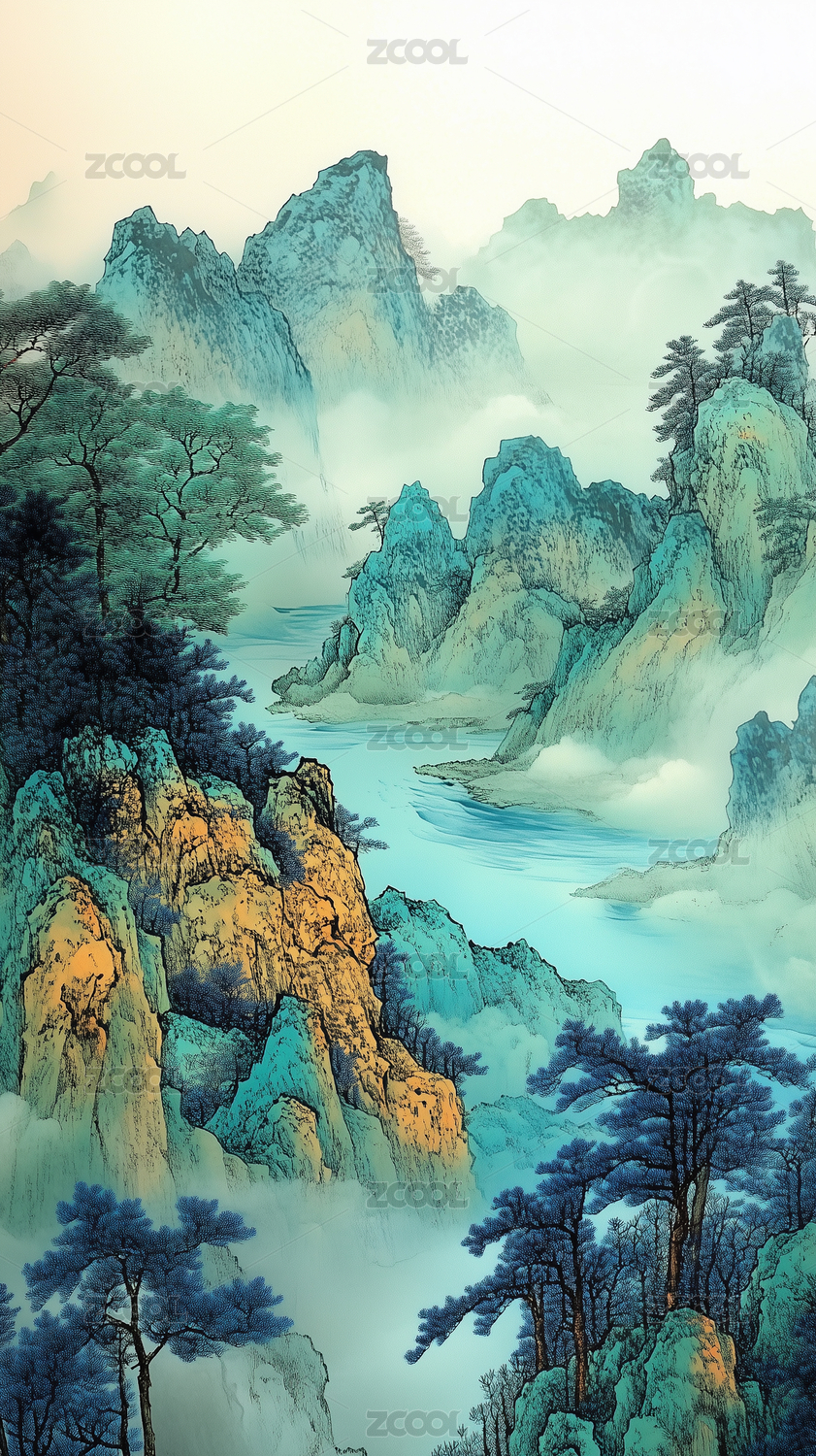 自然,插画,治愈,背景,艺术,泰山,松树,云雾,华山