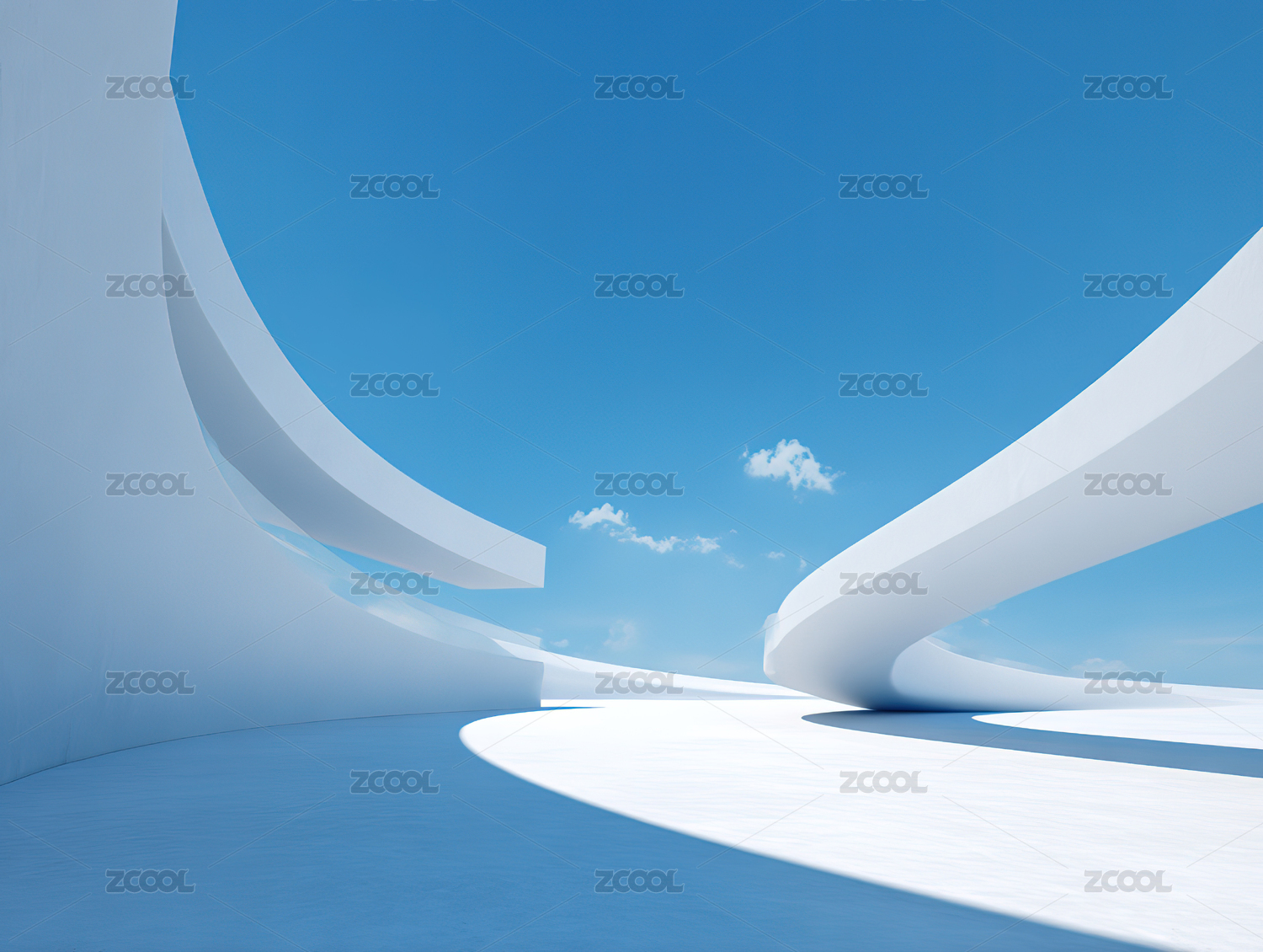 无人广场白色弯曲弧形建筑与倒影有天空背景