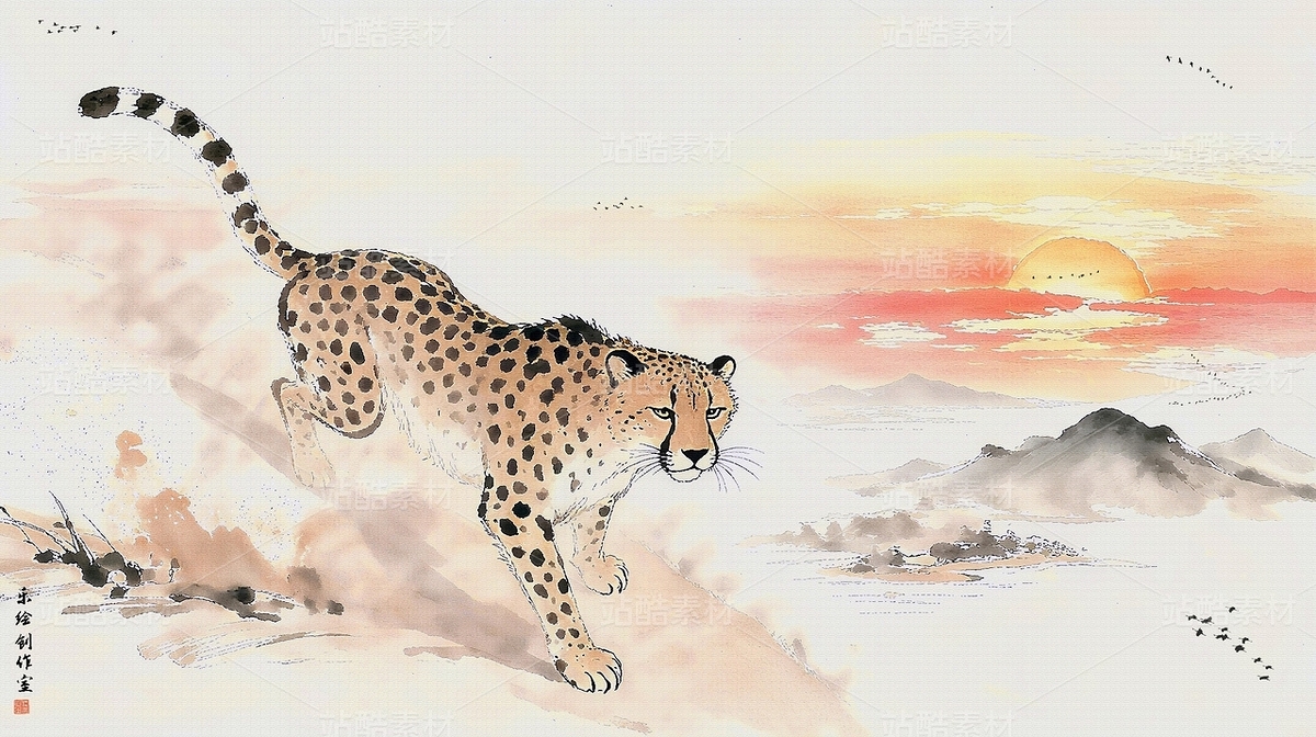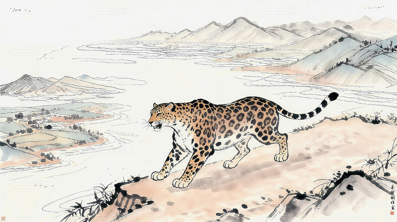 水墨山水金钱豹