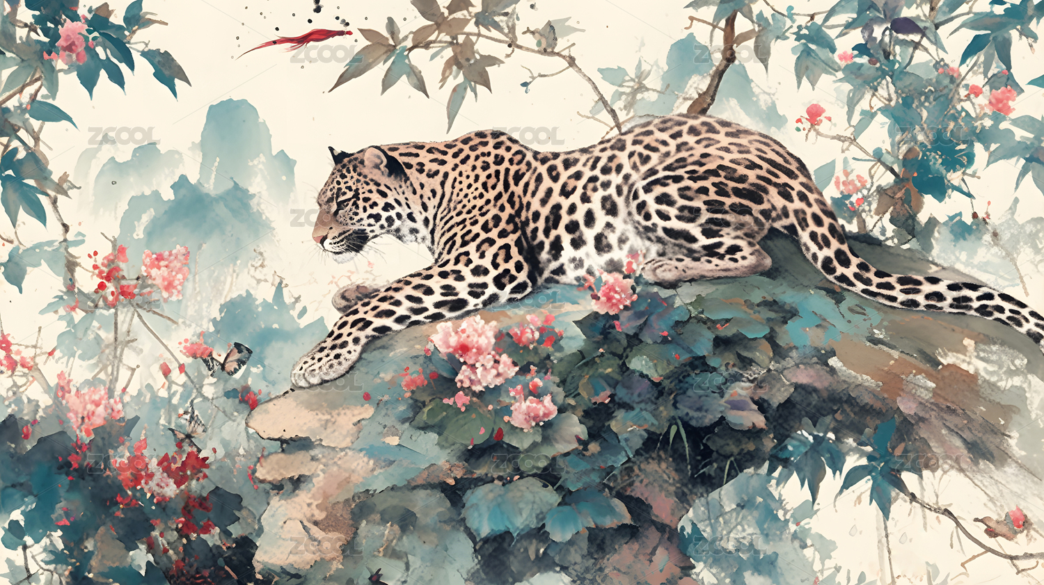 国风工笔豹子植物绘画