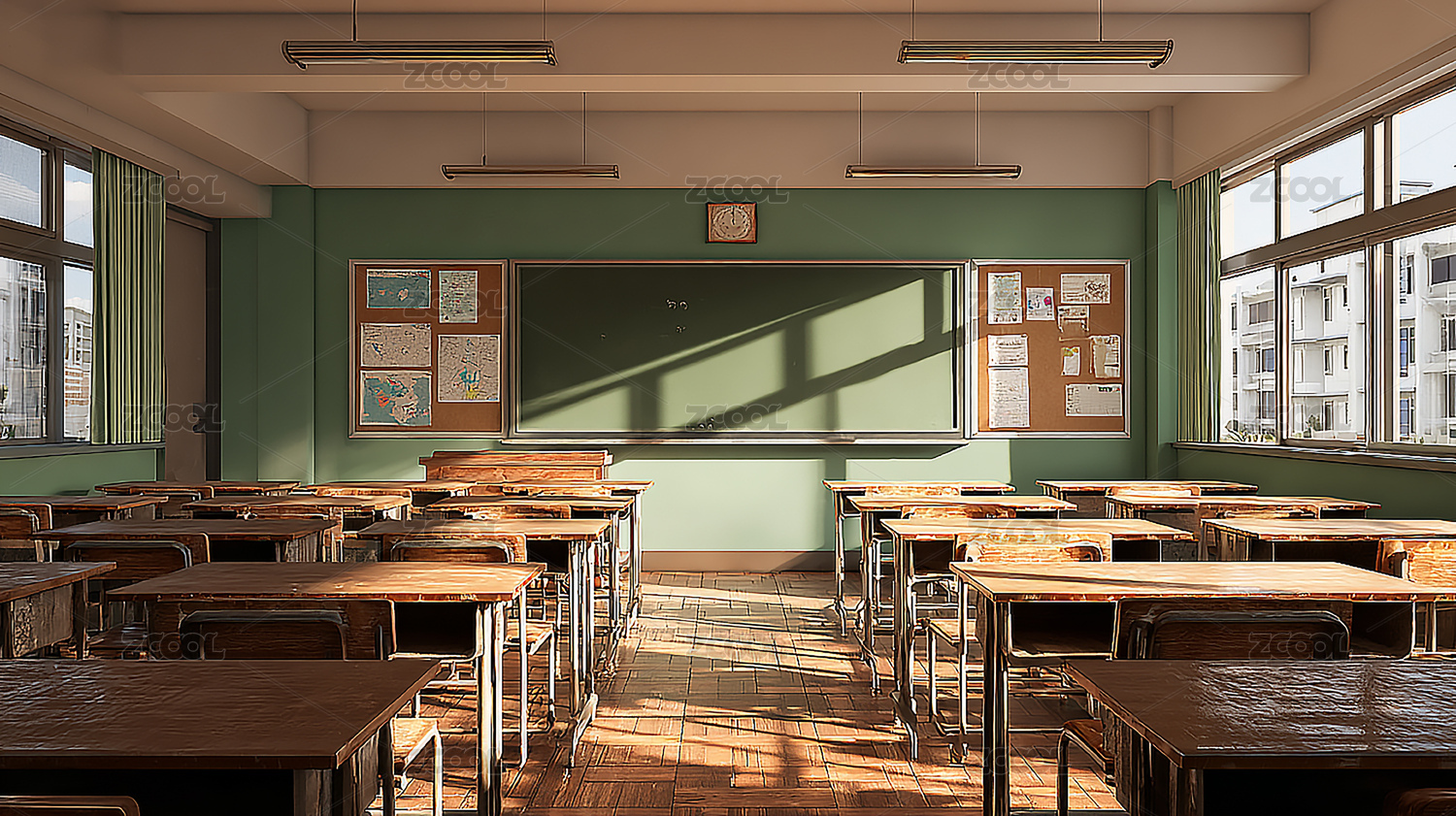教室,课桌,椅子,窗户,黑板,地板,阳光,光影,反射,玻璃