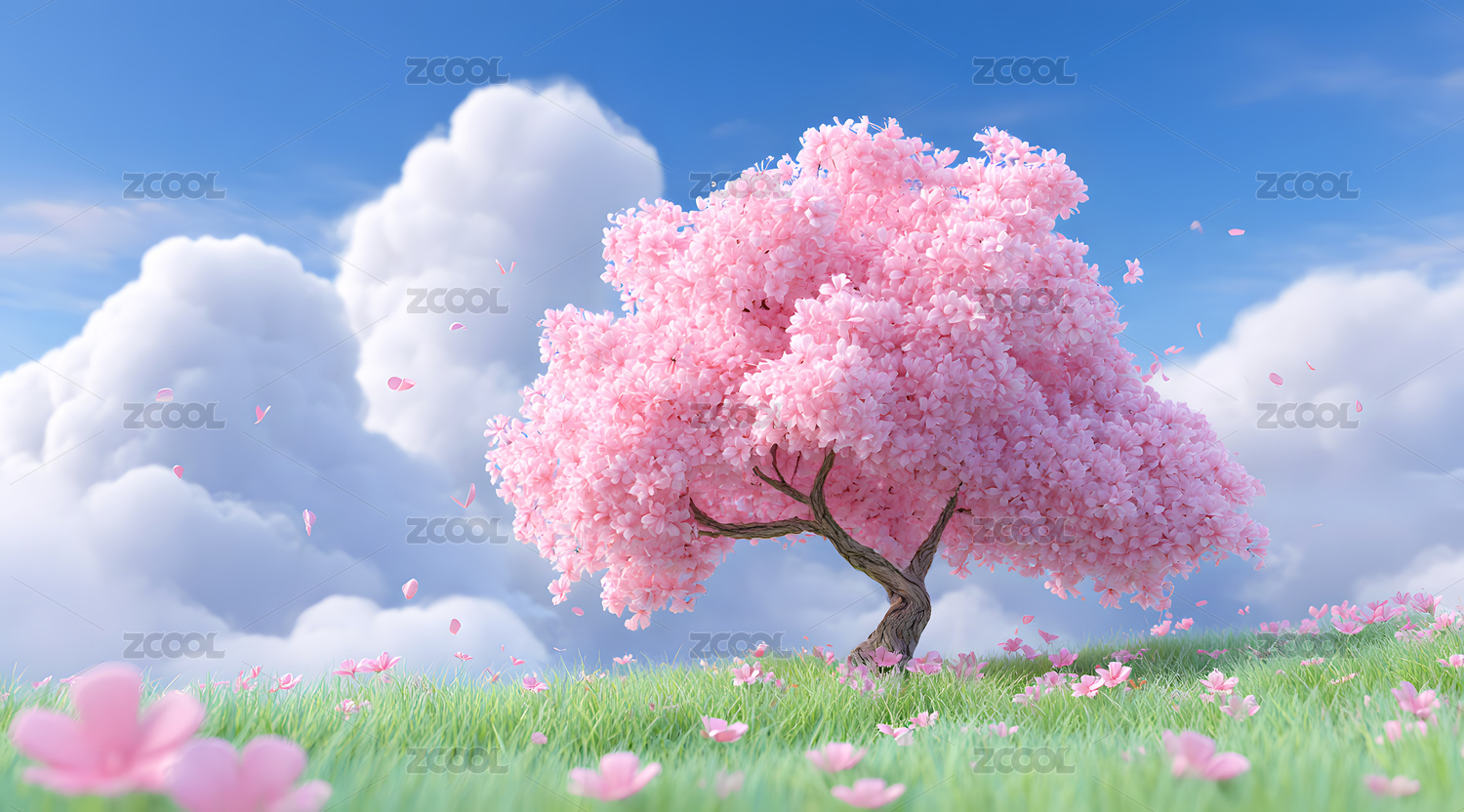 绿色草地上鲜花盛开的一棵树春天风景插画