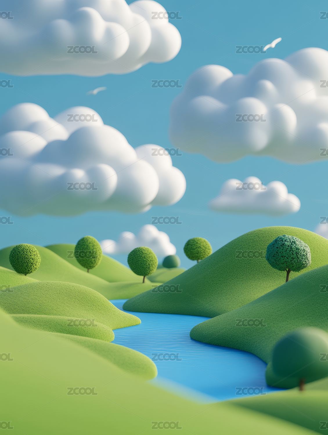 卡通风格的绿色山丘和树木