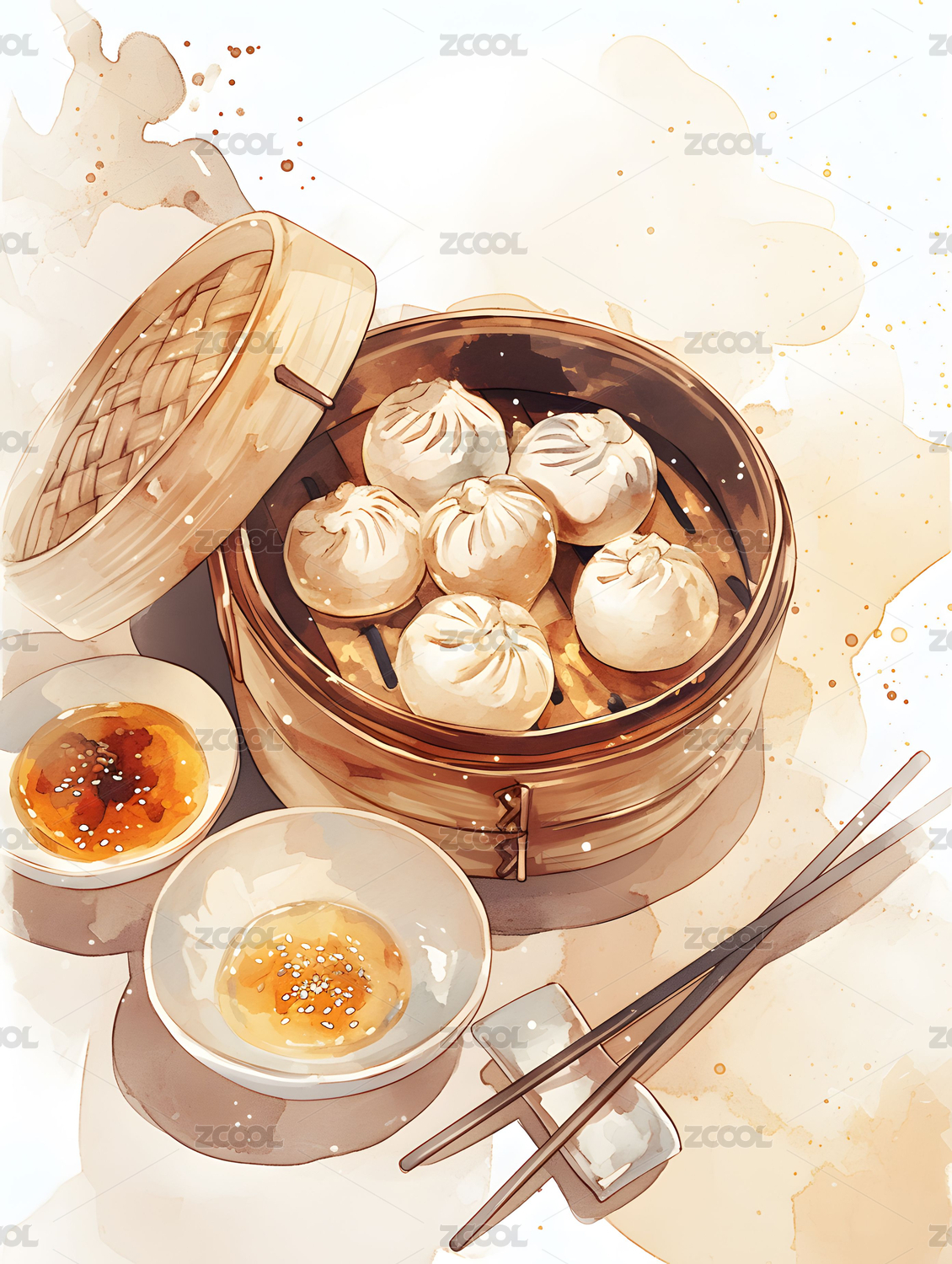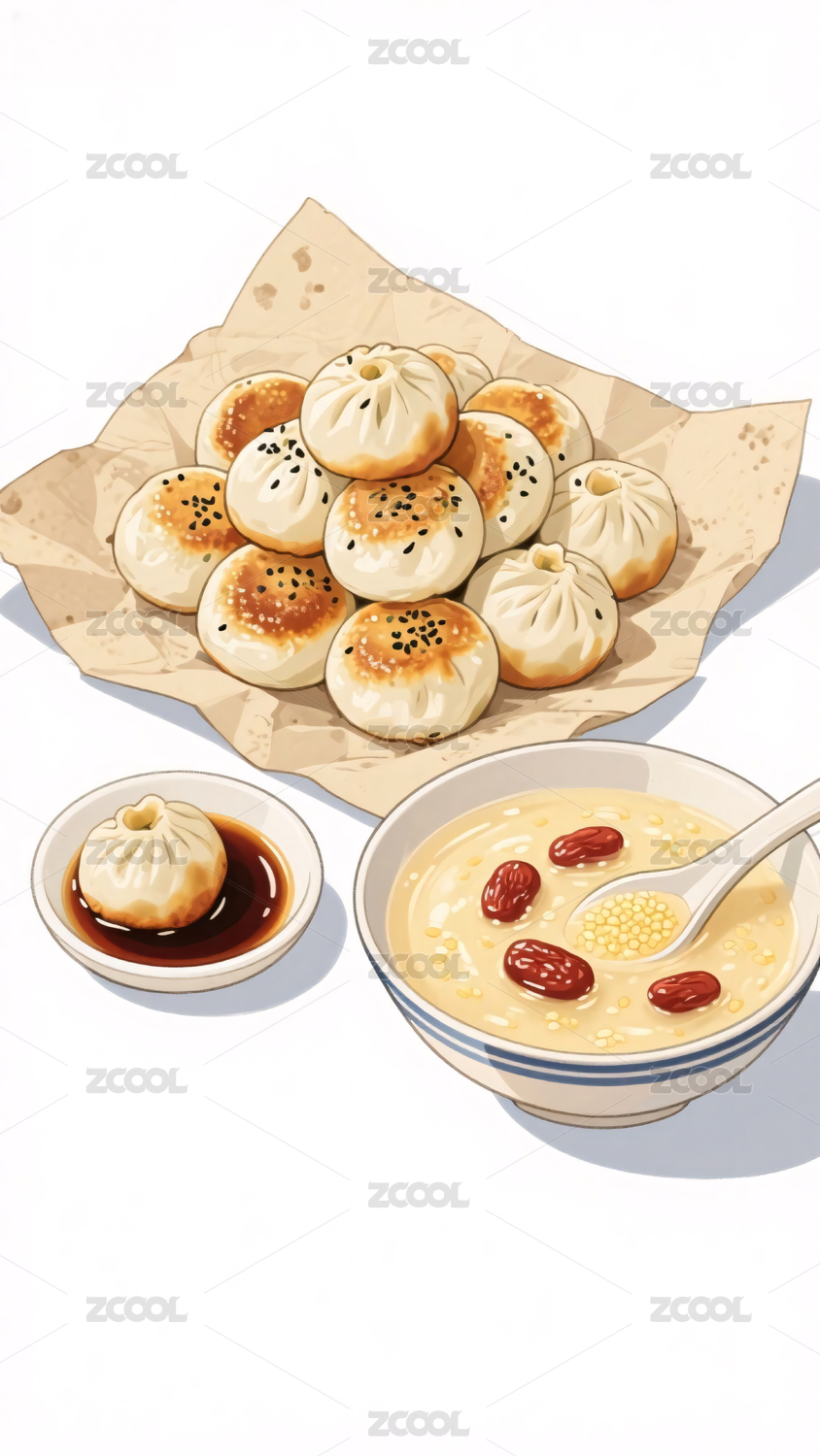 包子,煎包,小米粥,早餐,中式,早点,芝麻,红枣,蘸料,传统