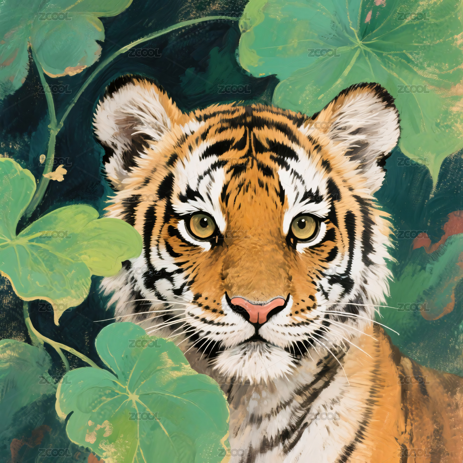 老虎,虎崽,幼虎,绿叶,树林,萌宠,动物,自然,可爱,插画