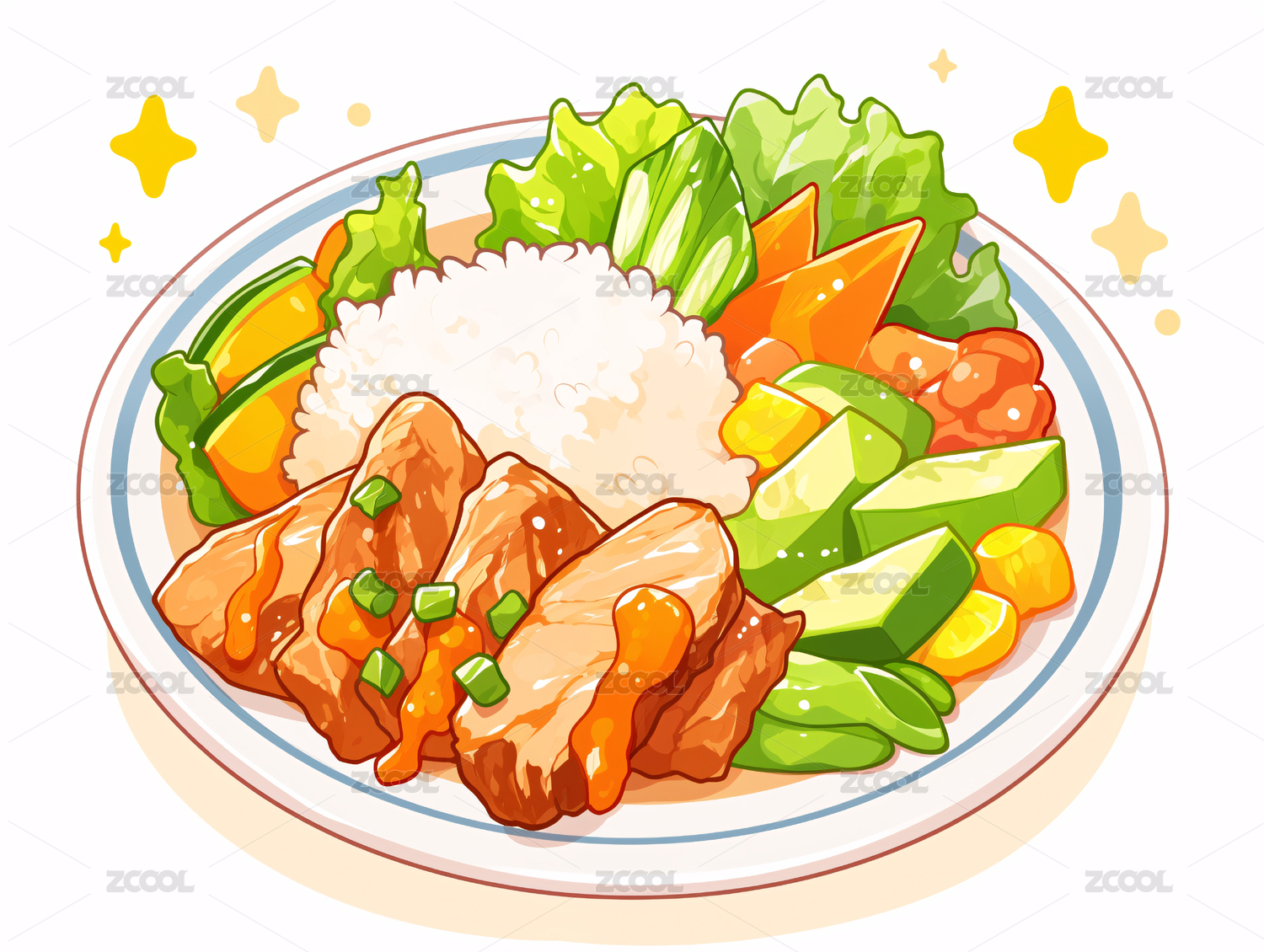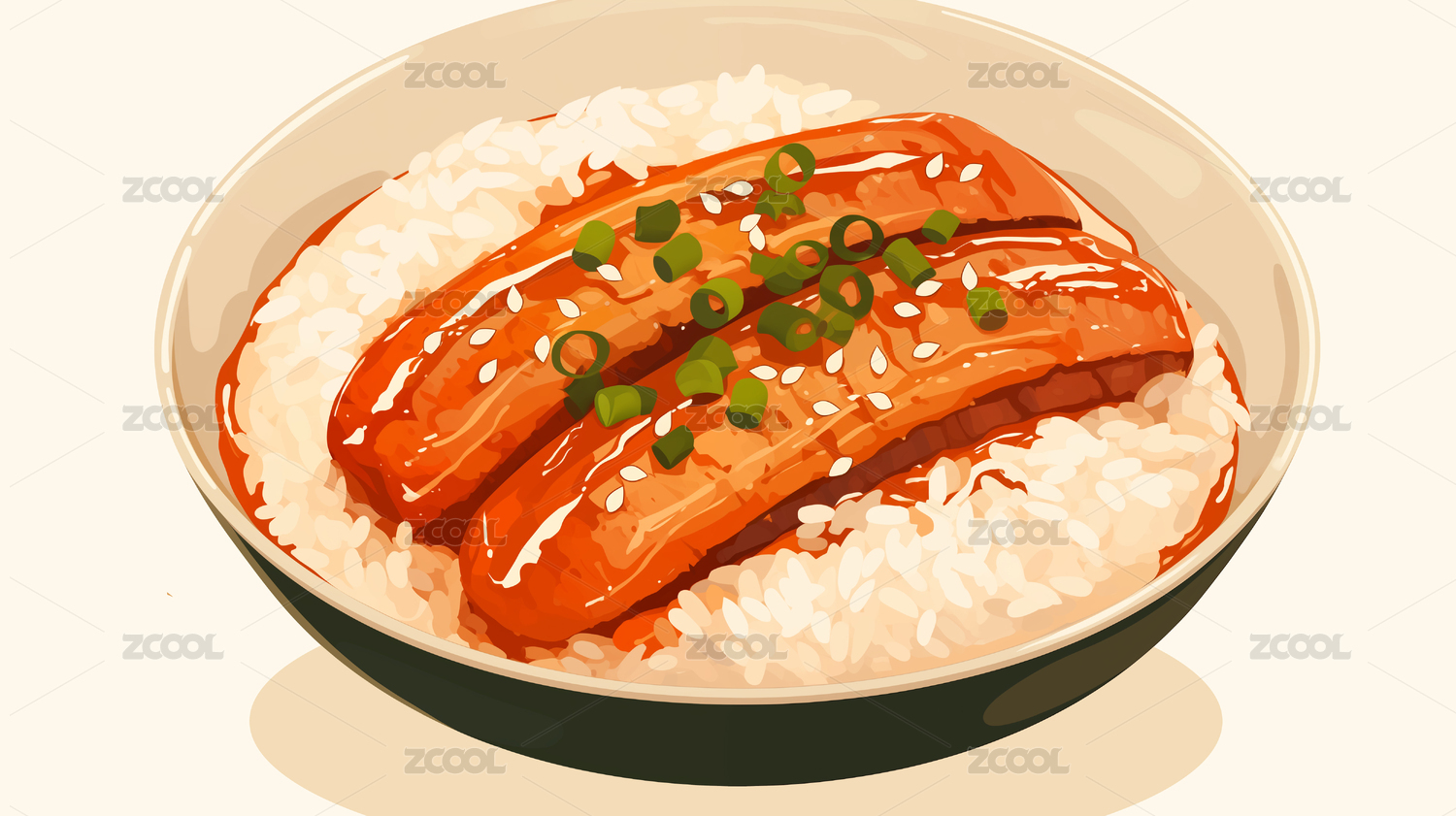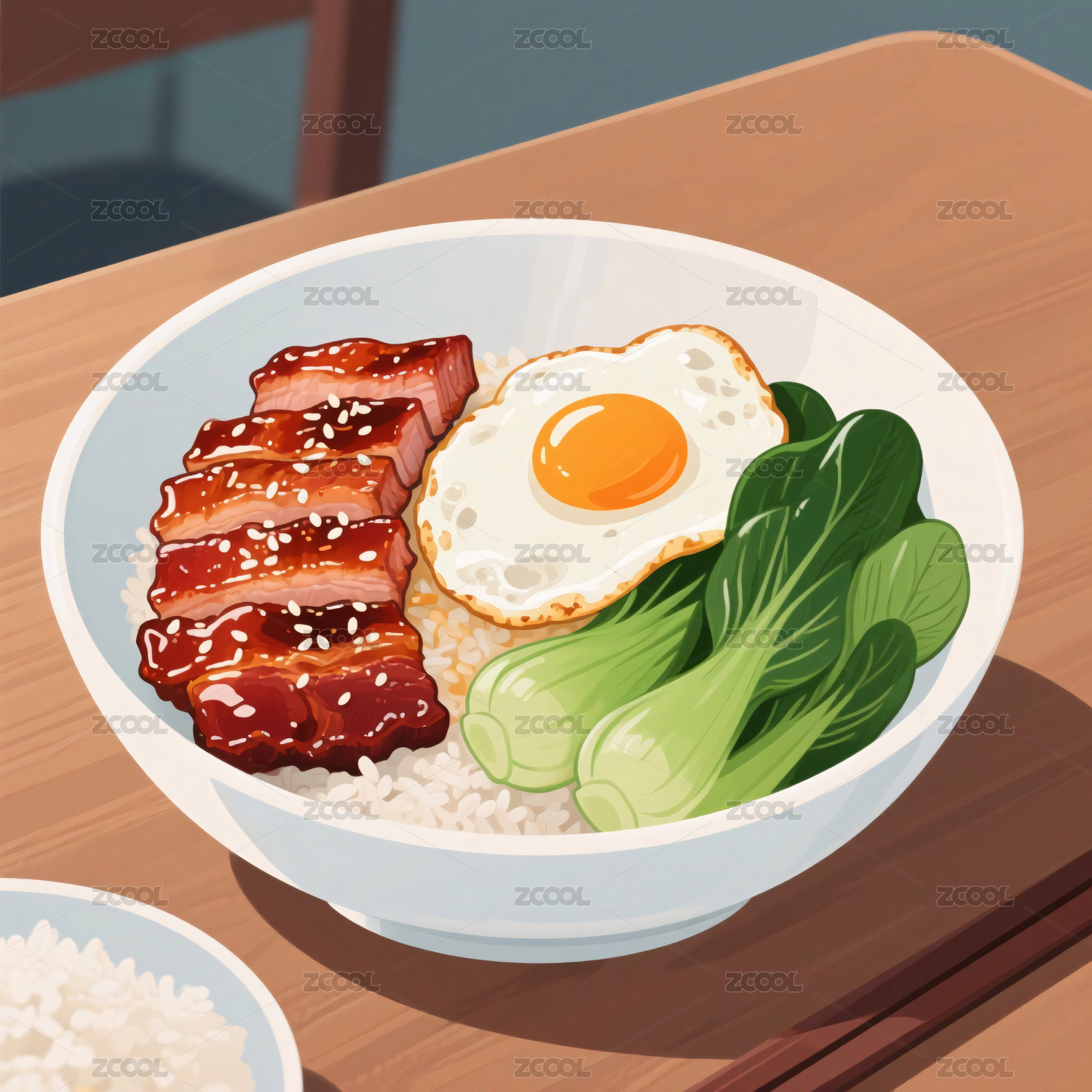 叉烧饭,煎蛋,米饭,青菜,美食,盖浇饭,手绘,插画,快餐,午餐