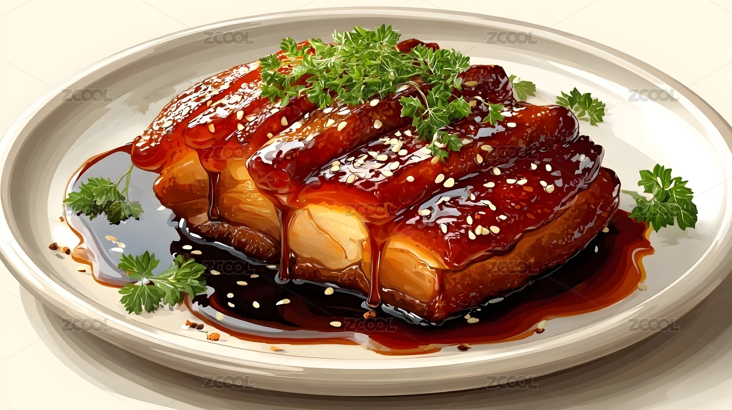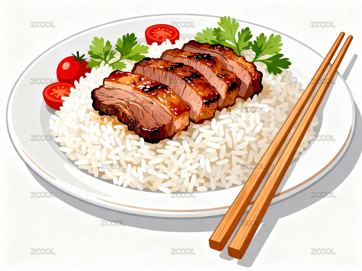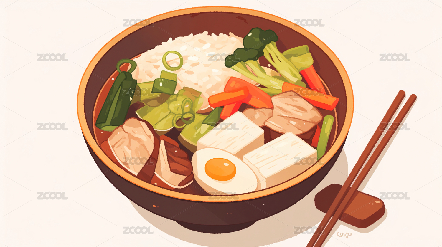 叉烧饭,煎蛋,米饭,青菜,美食,盖浇饭,手绘,插画,快餐,午餐