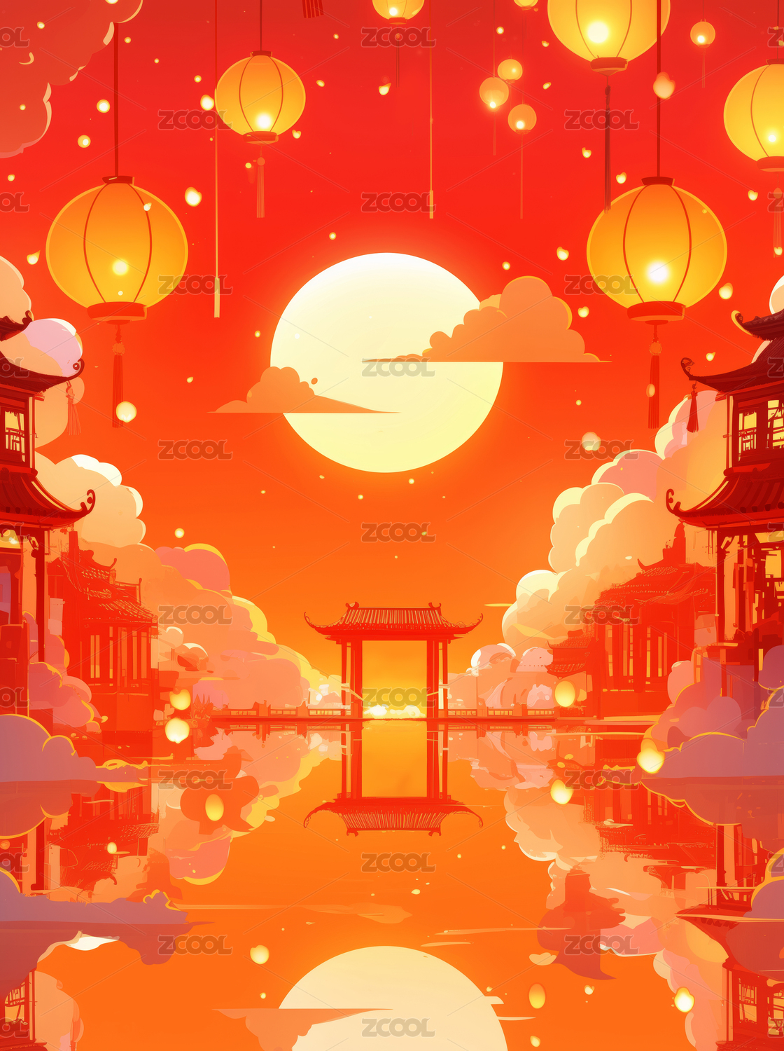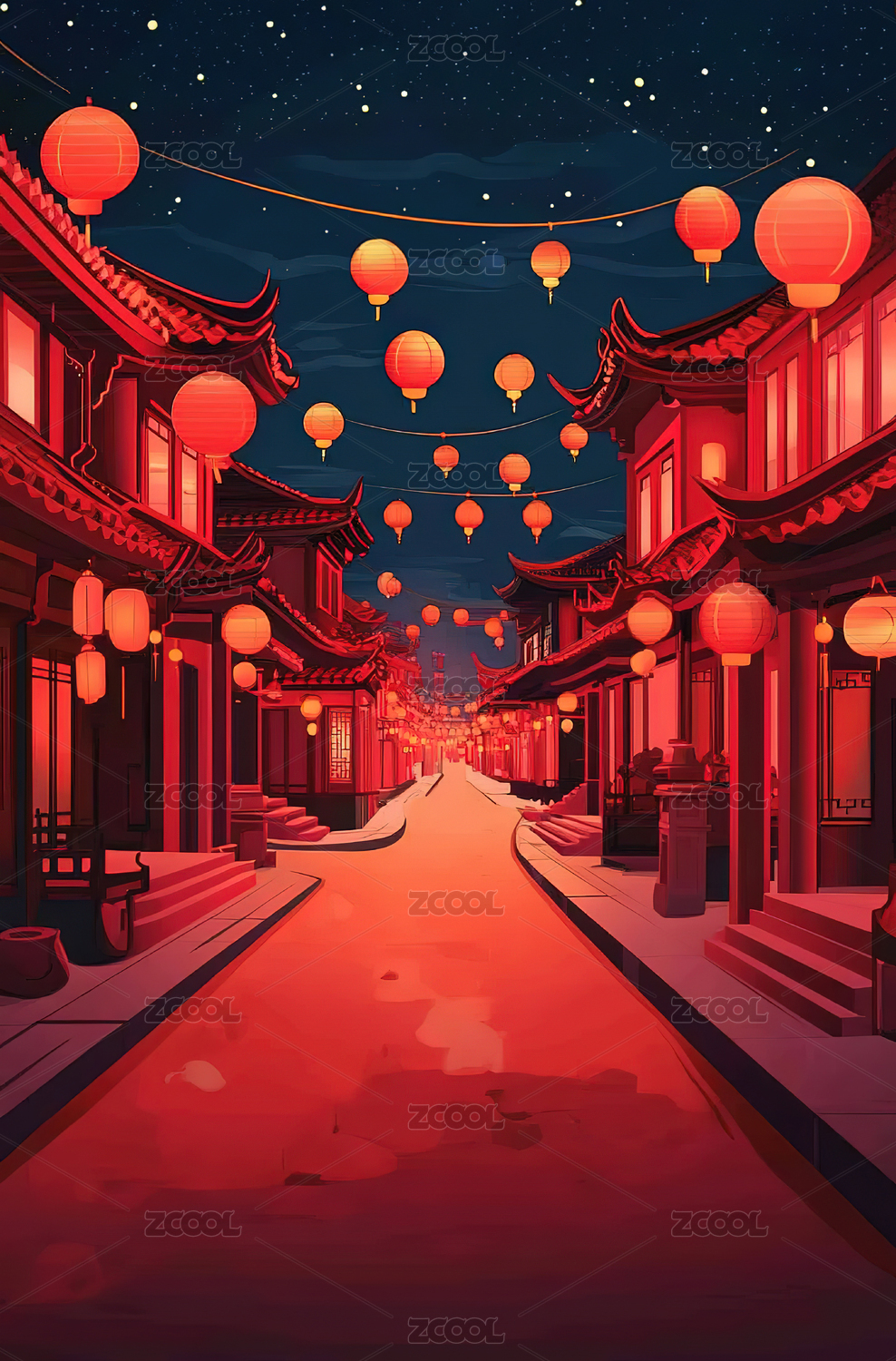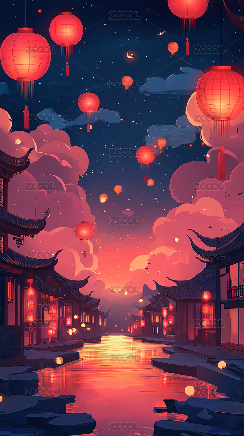 天空,红色,装饰,建筑,树木,光影,灯笼,月亮,街道,云层