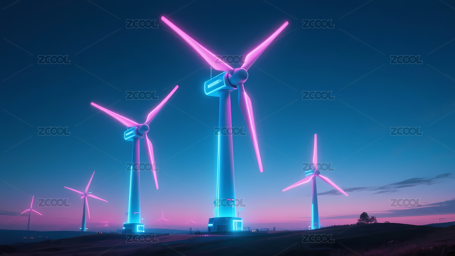 风力发电机,风车,清洁能源,环保,电力,新能源,夜景,风电叶片,蓝色光效,夜晚