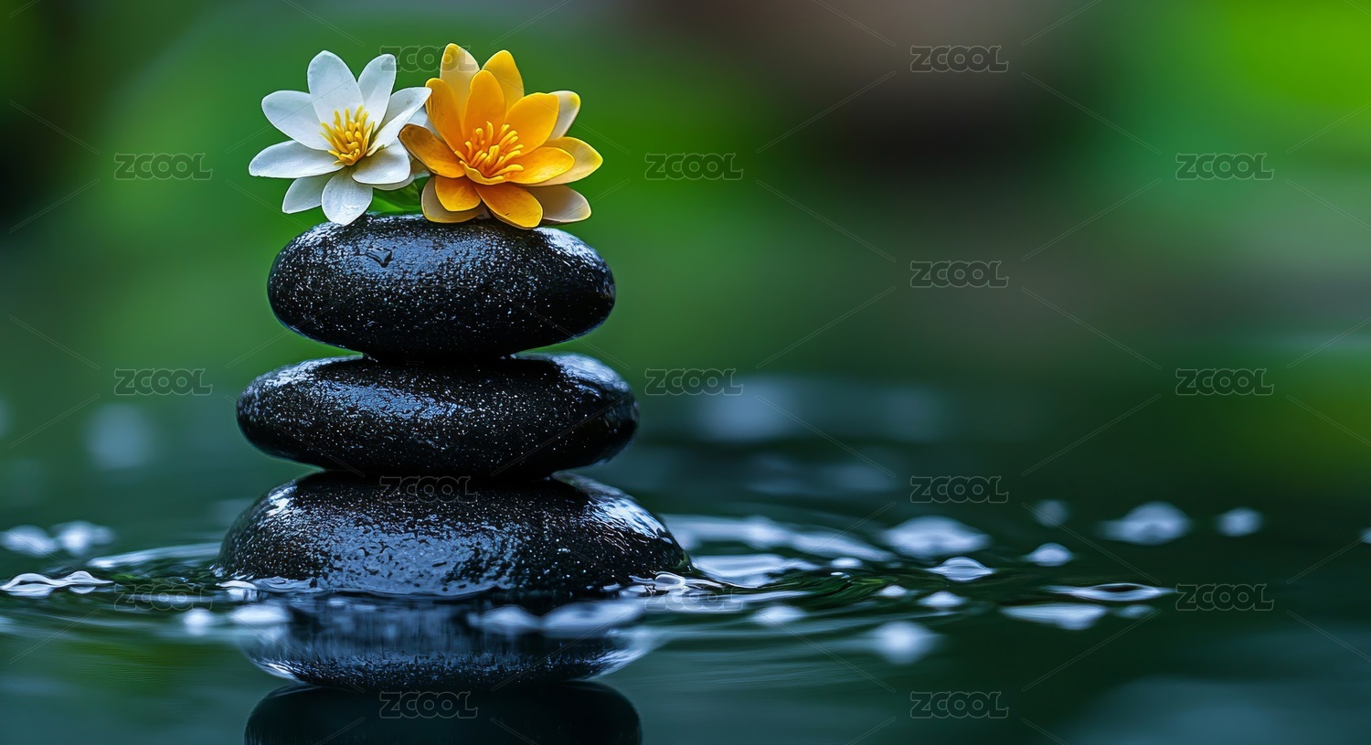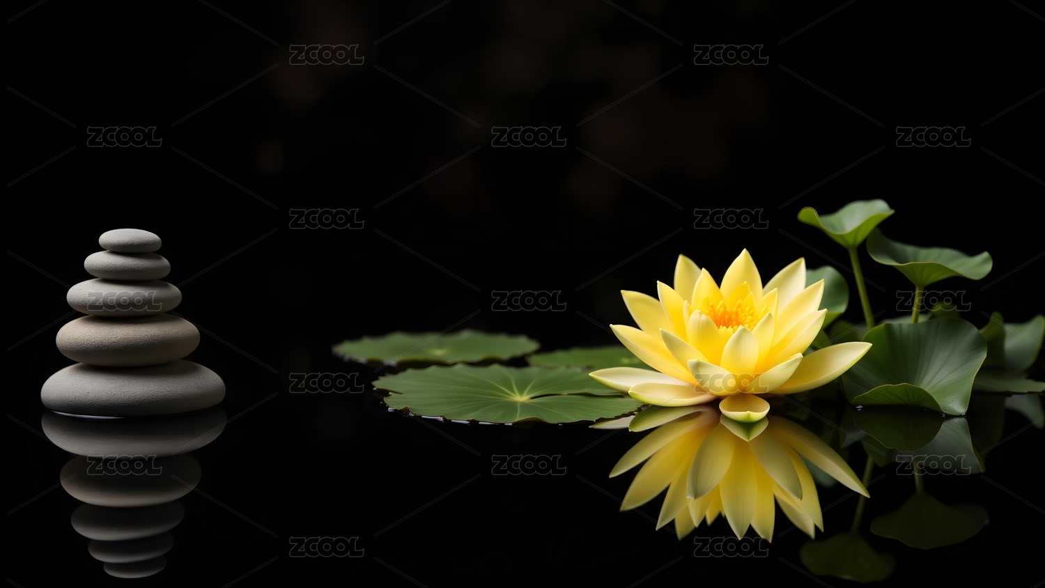 禅意,莲花,自然,石堆,倒影,黄色,荷叶,静物,黑色背景,水面