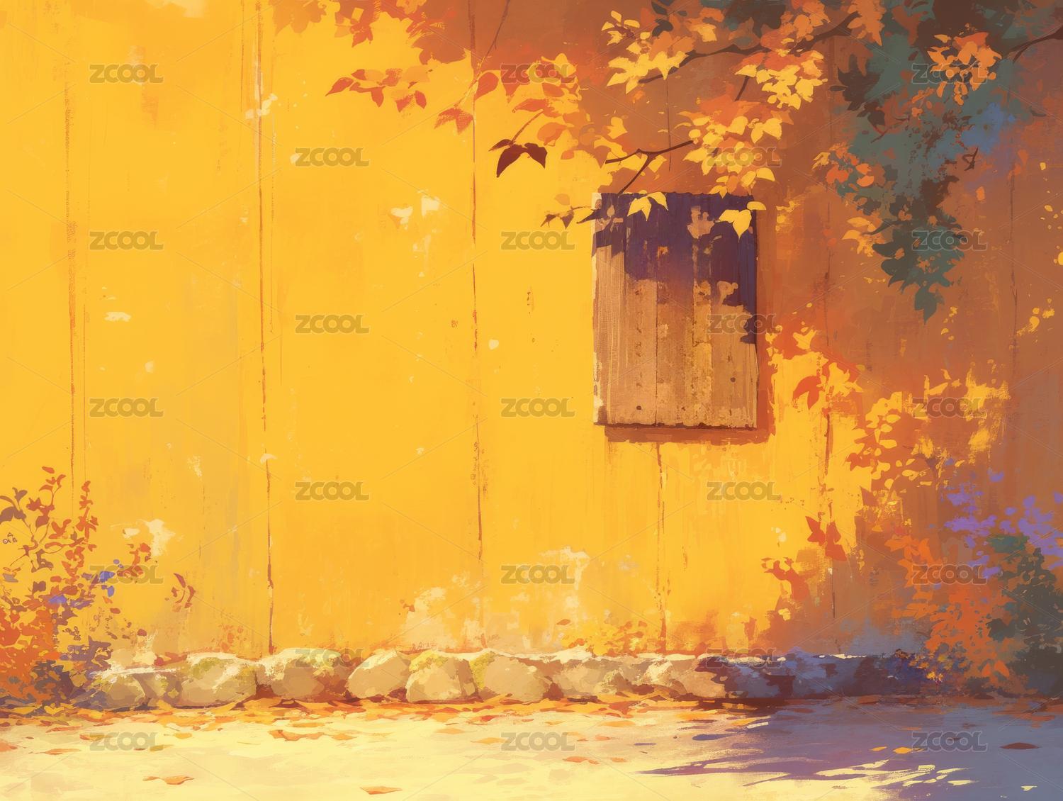 秋日暖阳下的木门黄色的墙留白背景
