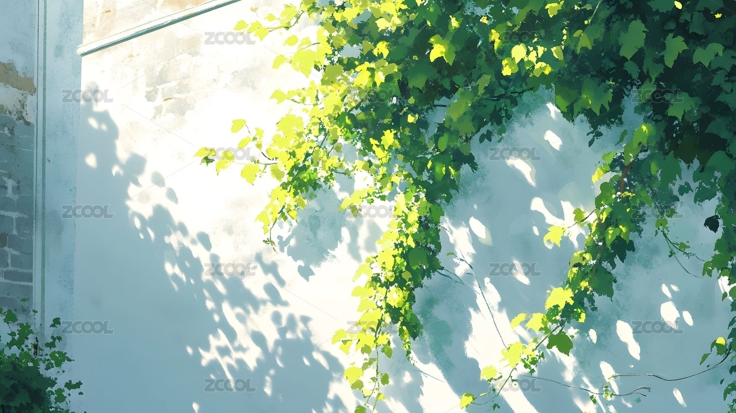 老墙上翠绿藤蔓与斑驳光影