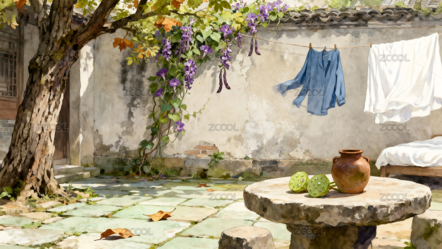 阳光下的花园一隅水彩画