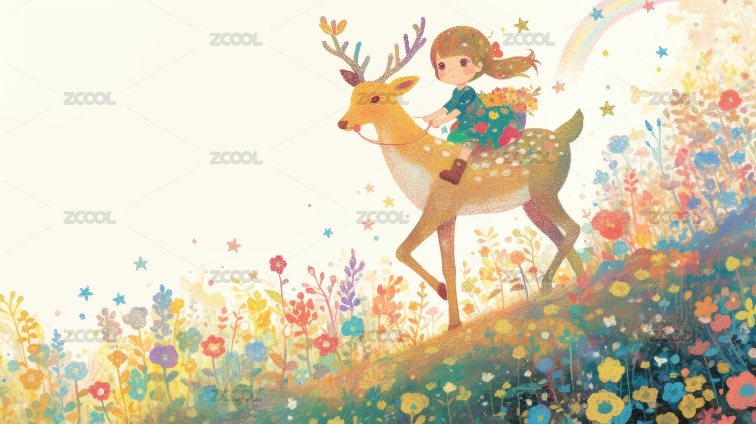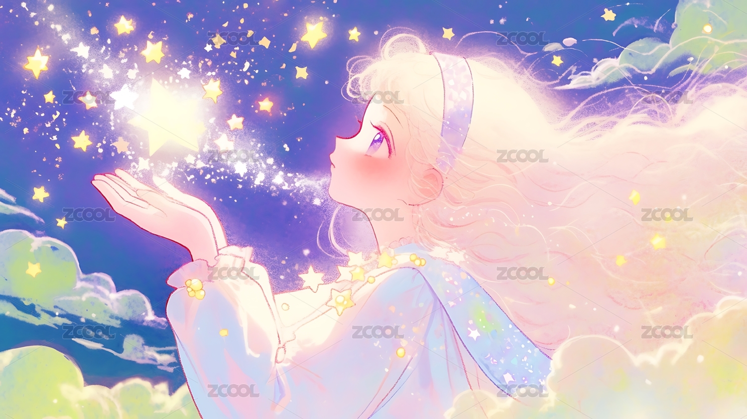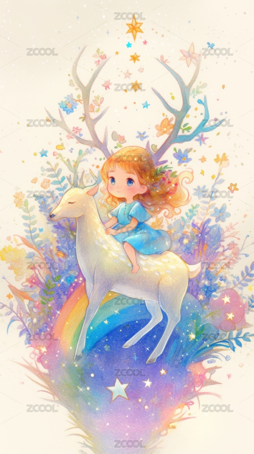 插画,卡通,漫画,中国风,国潮风,少女,彩虹,梦幻,云朵,艺术