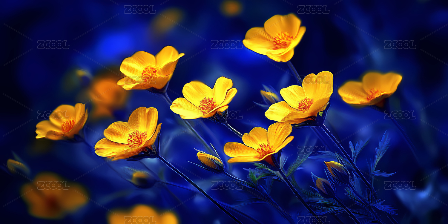 深蓝背景下绽放的黄色花朵