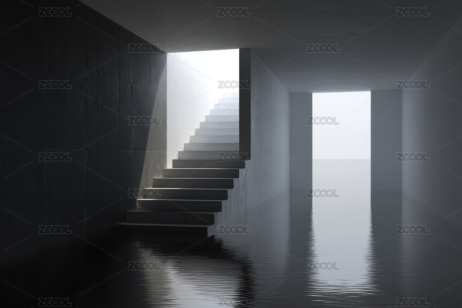 光影交错的混凝土阶梯与雾气