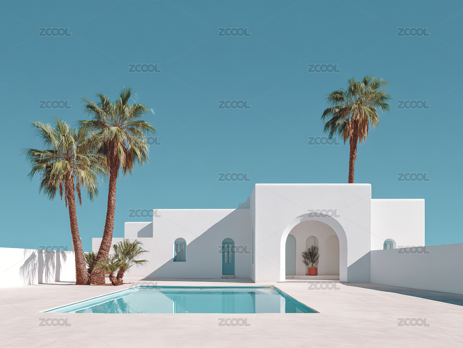 白色建筑与泳池的热带风光