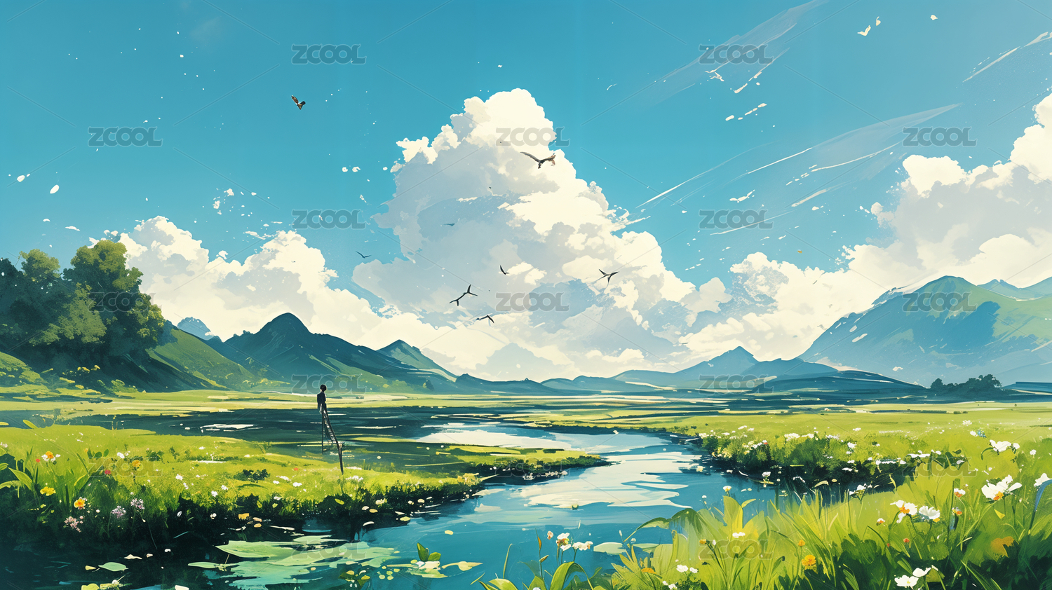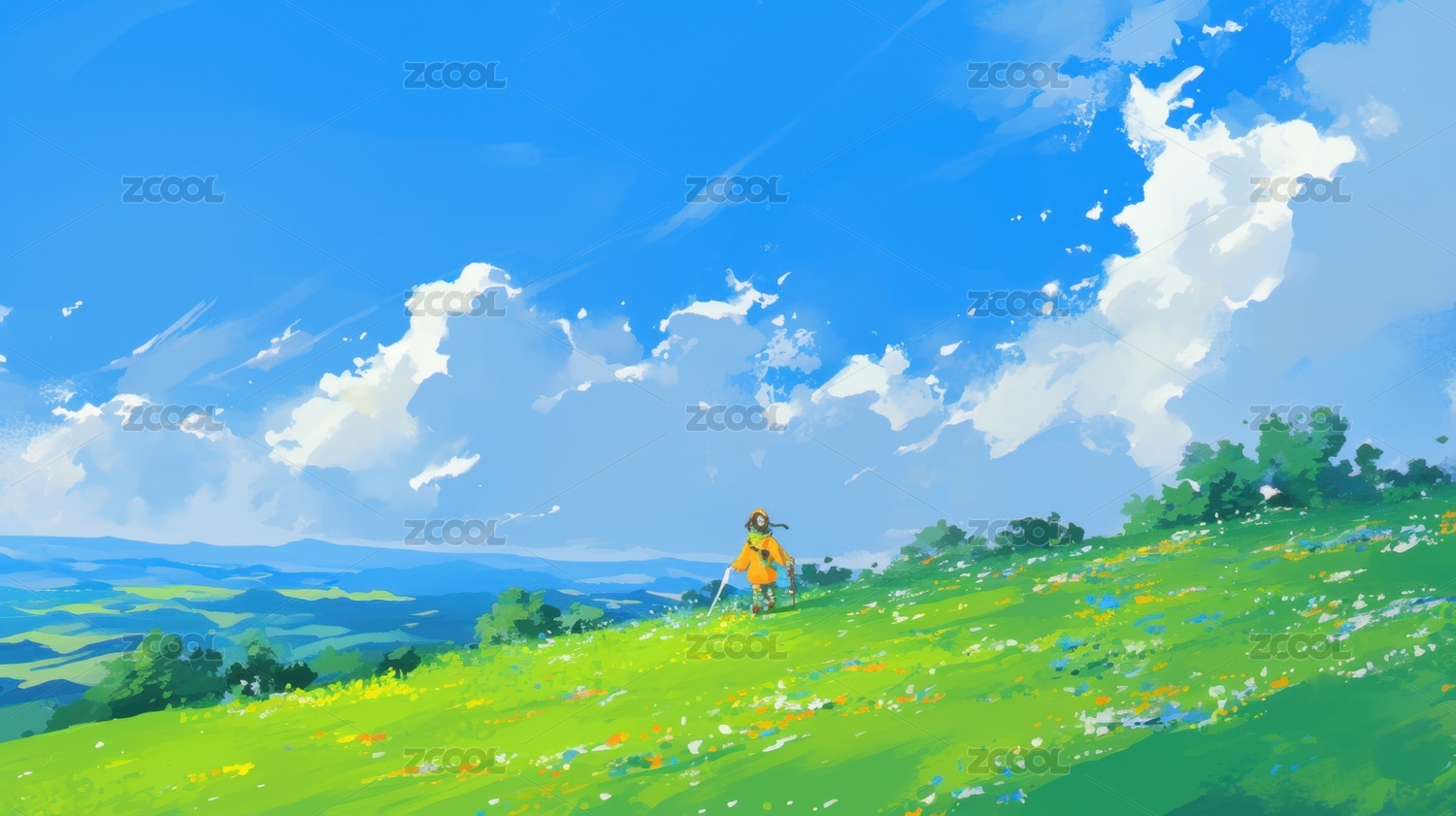 油画质感夏日山坡草地鲜花蓝天白云风景背景