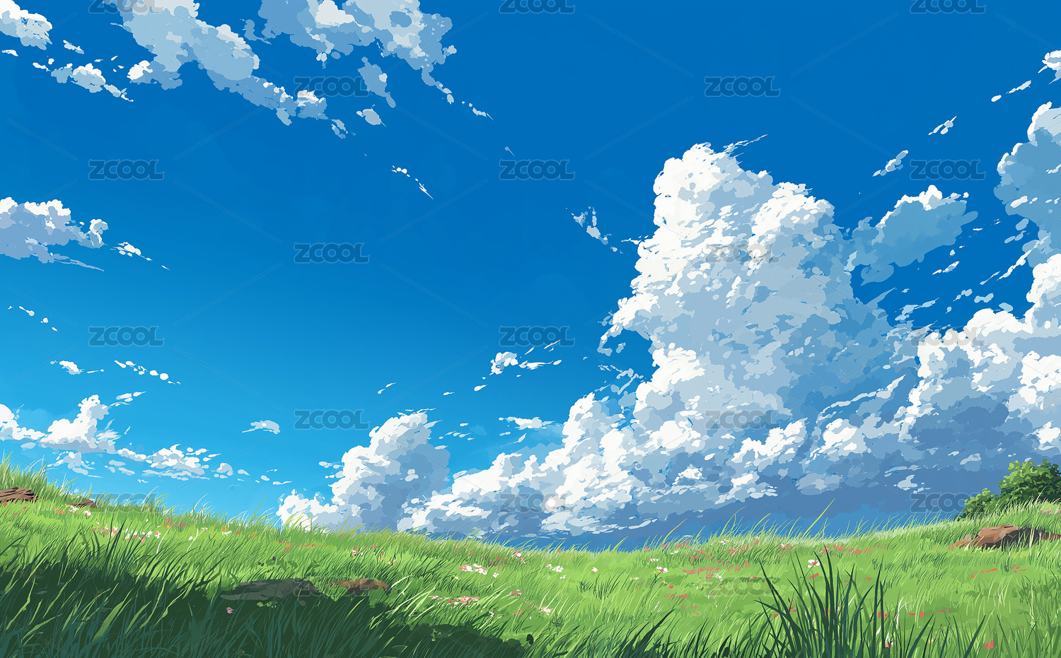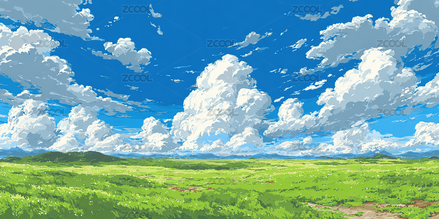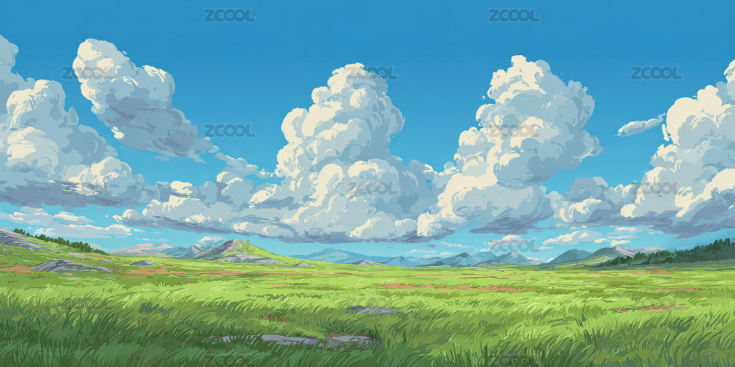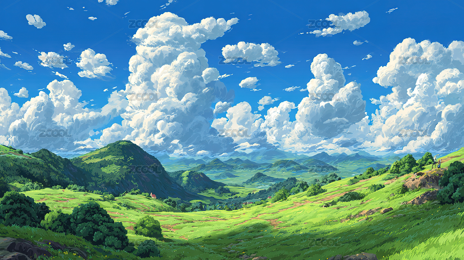 蓝天云朵青山绿野治愈系动漫风景插画背景素