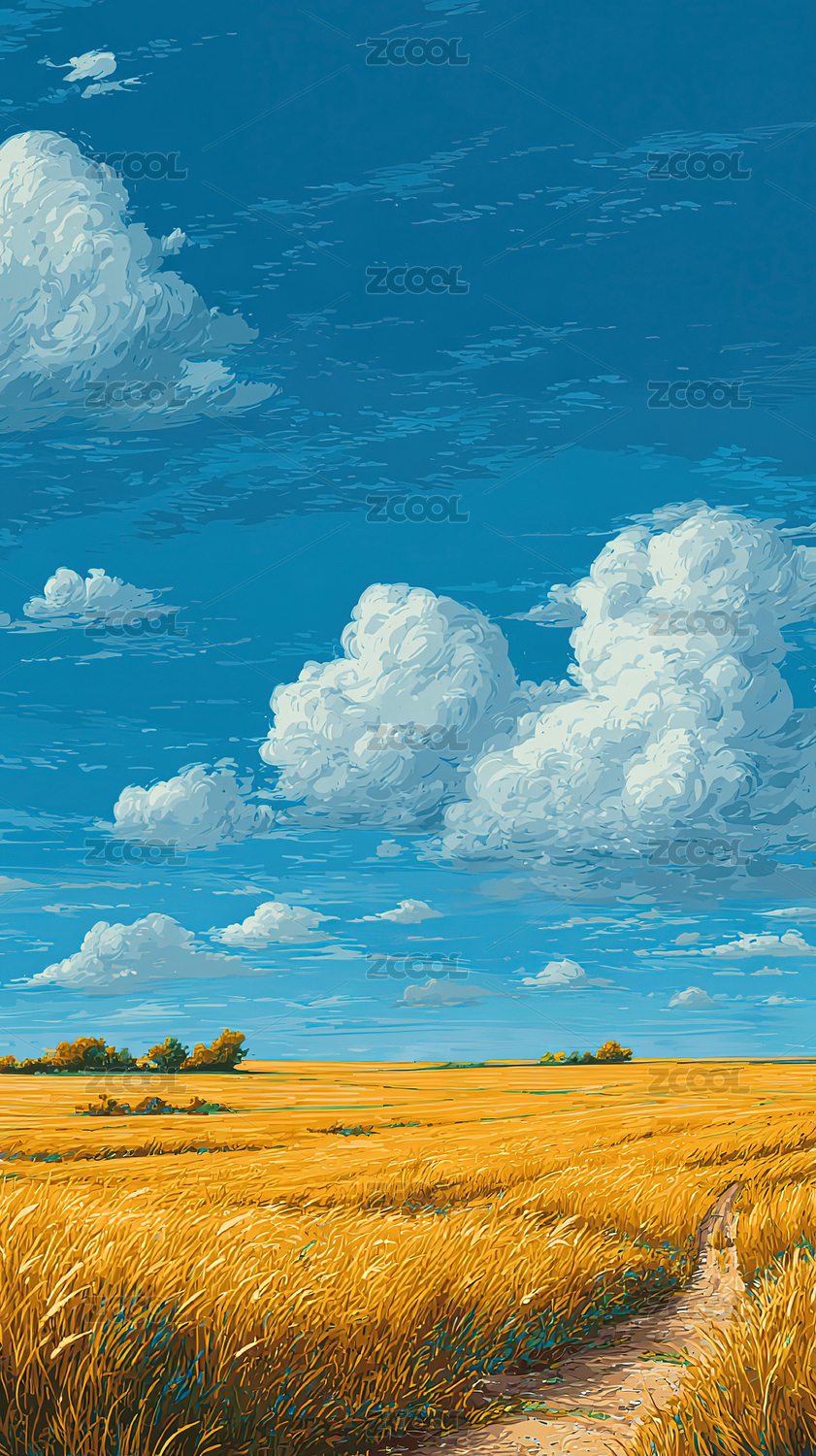 秋日田园云朵风景插画治愈系背景素材
