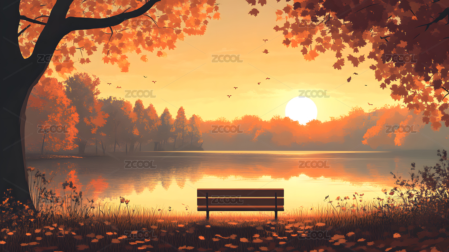 秋天湖边风景插画
