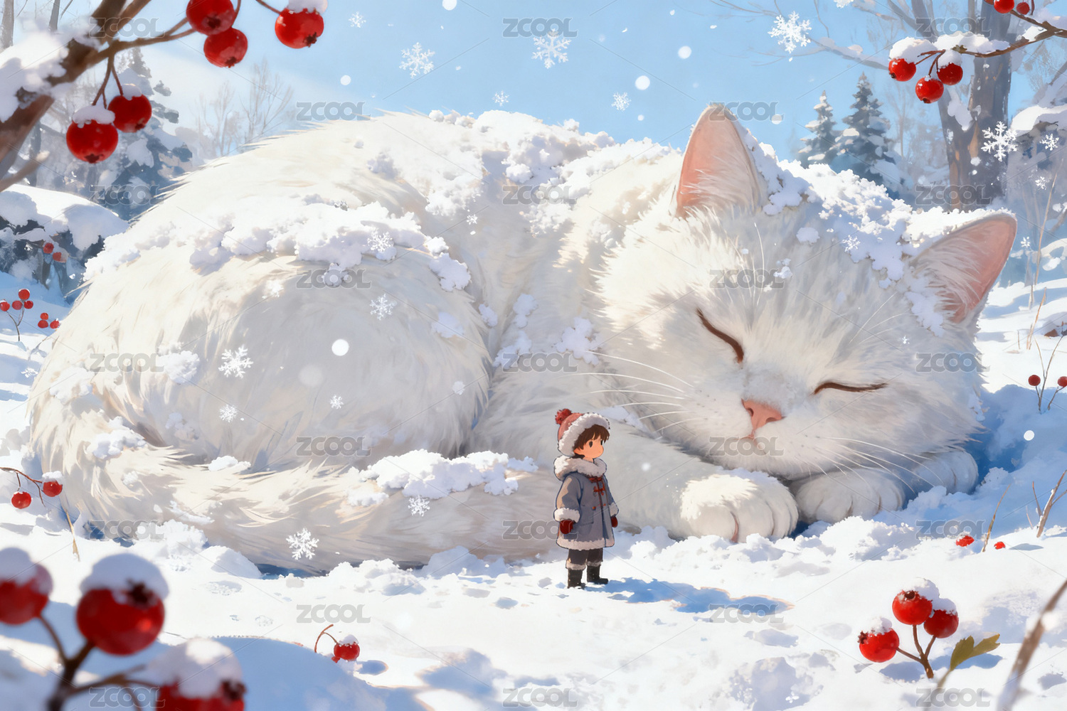 白色,背景,红色,帽子,可爱,雪花,冬季,飘落,猫咪,孩童