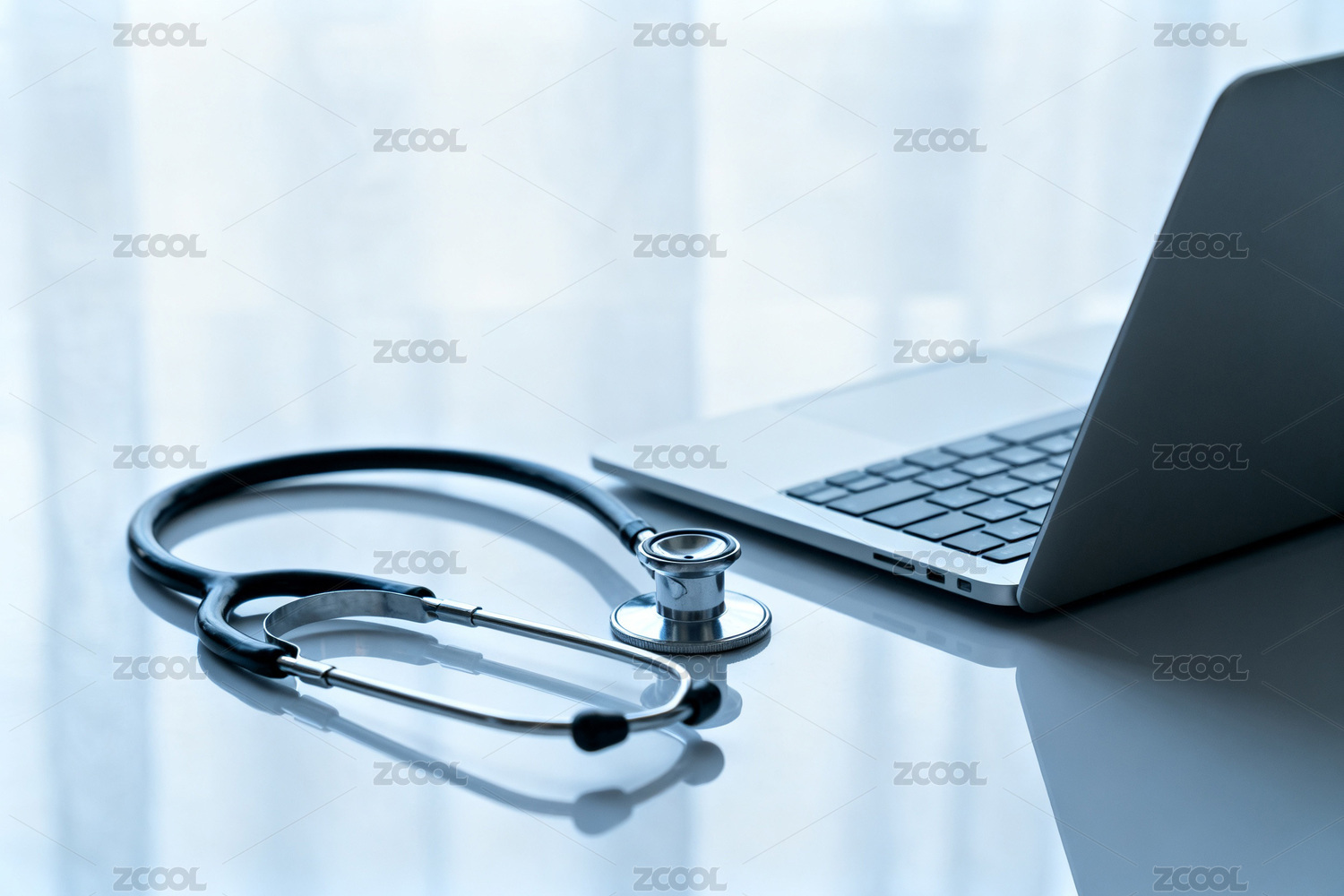 医学研究,笔记本电脑键盘听诊器,医生工作场所