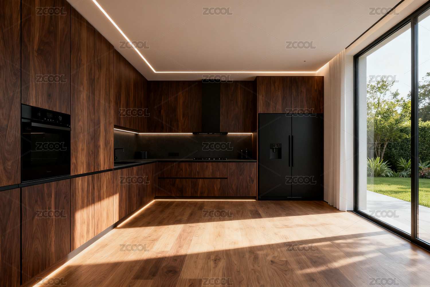 厨房,橱柜,木质,黑色,台面,水槽,水龙头,烤箱,窗户,玻璃