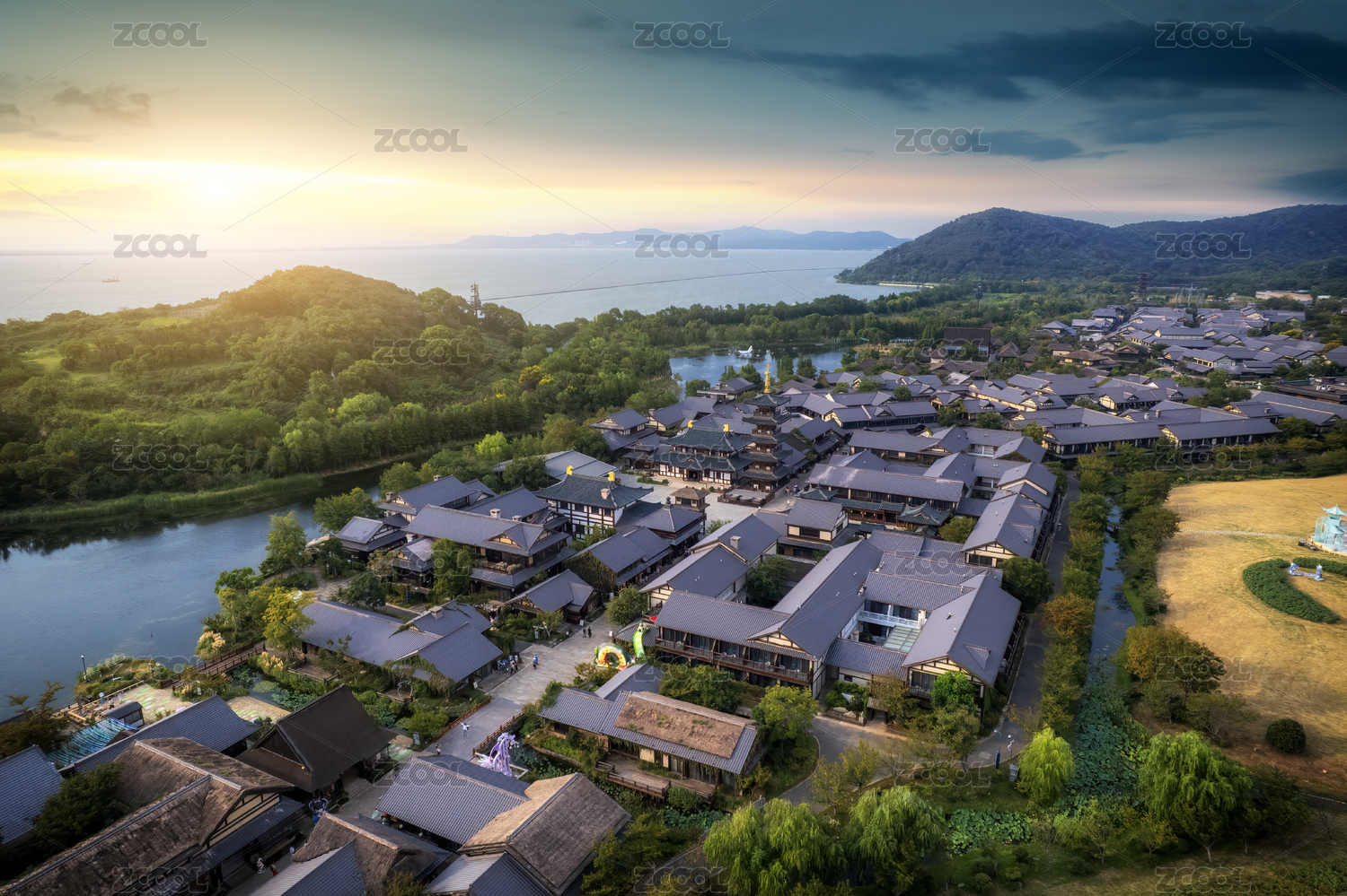 航拍湖州长兴日落自然建筑风光