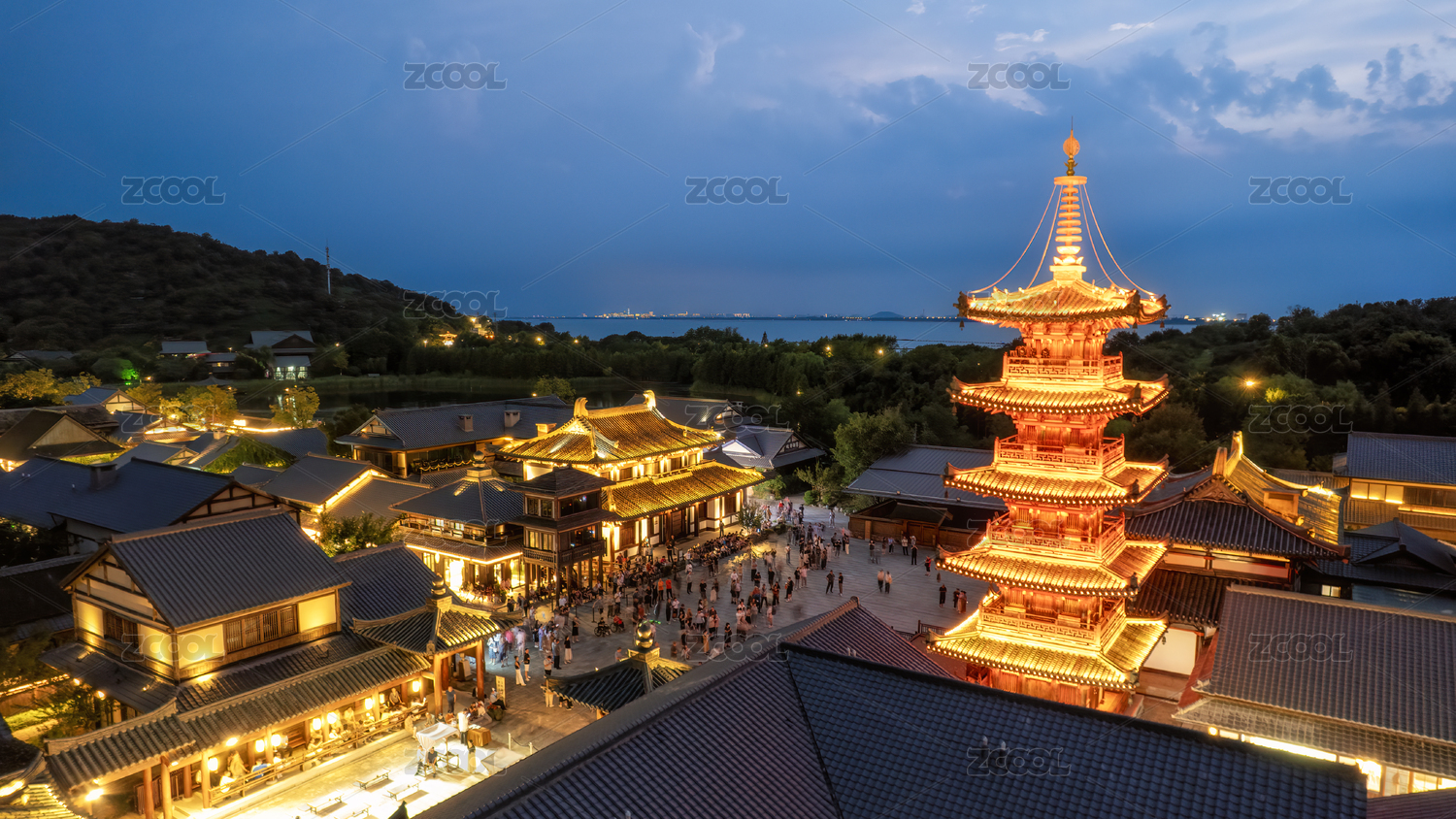 中国江苏无锡拈花湾禅意小镇全景之夜