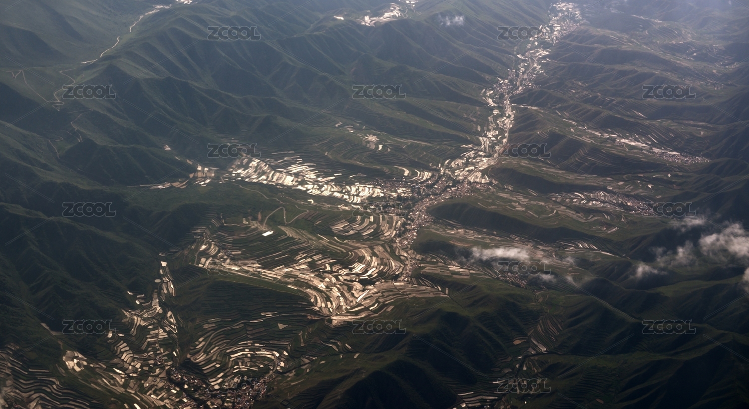 航拍中国西北山区谷地中的梯田群