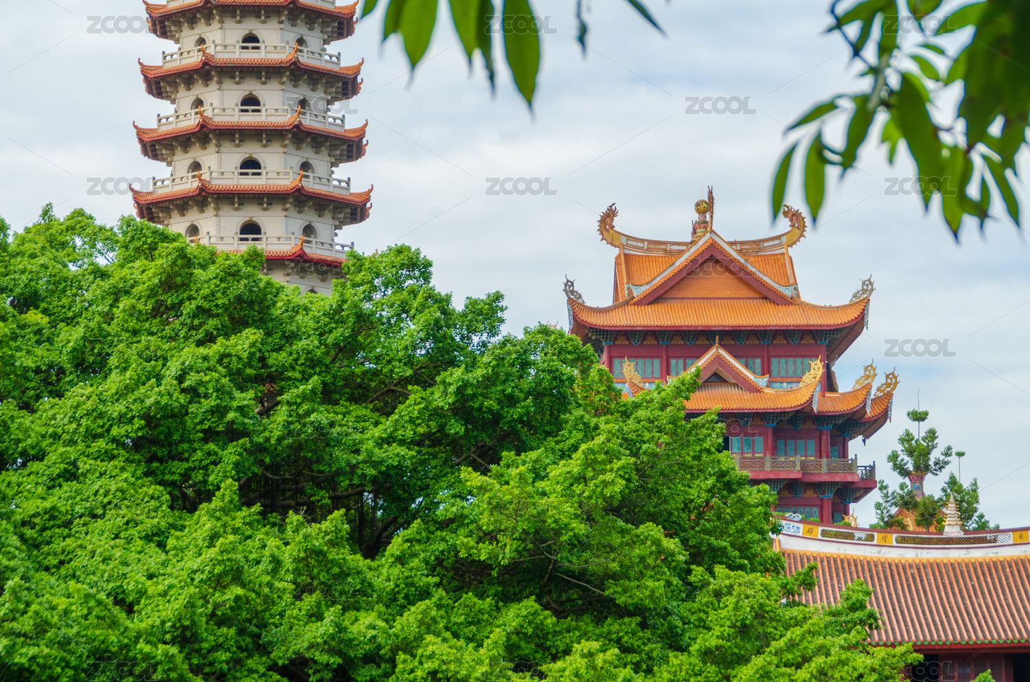 福建省福州市西禅寺古塔与彩绘屋檐的风景